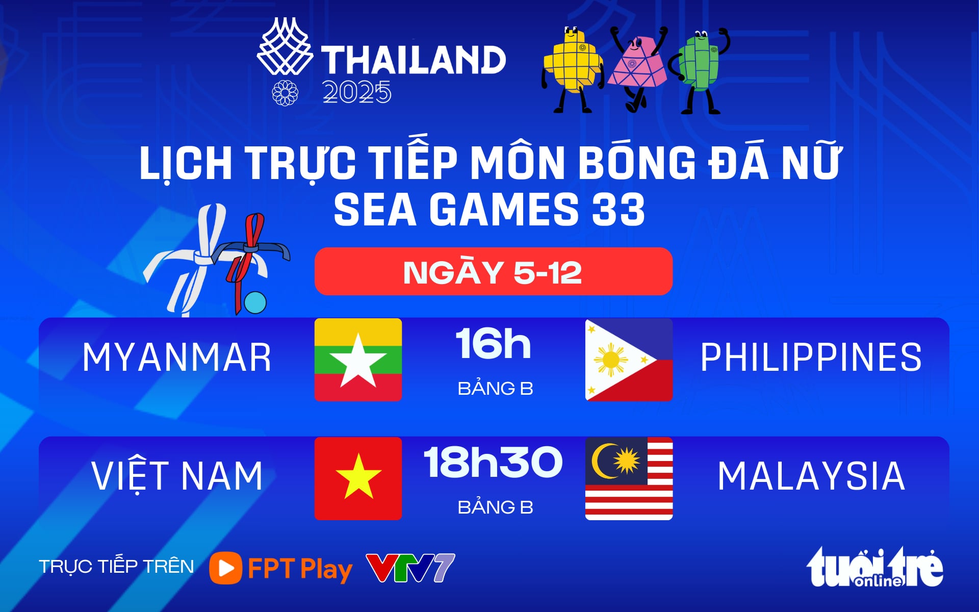 Trận đấu giữa tuyển nữ Việt Nam và Malaysia lúc 18h30 trên sân Chonburi, được trực tiếp trên FPT Play, VTV7, các kênh sóng của THVL, HTV, và các ứng dụng VTVgo, Mytv...