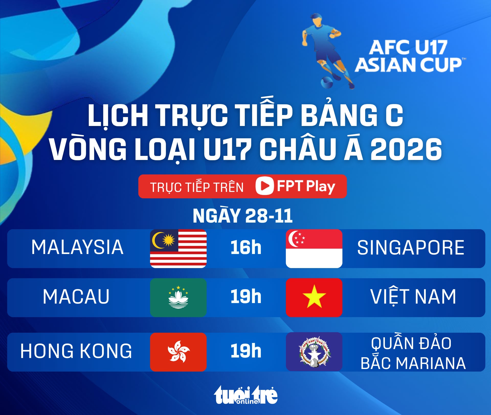 Vào 19h hôm nay (28-11), U17 Việt Nam sẽ đối đầu U17 Macau ở lượt trận thứ 4 bảng C vòng loại U17 châu Á 2026. Ở hai cặp đấu còn lại, U17 Malaysia gặp U17 Singapore và U17 Hong Kong chạm trán U17 Quần đảo Bắc Mariana.