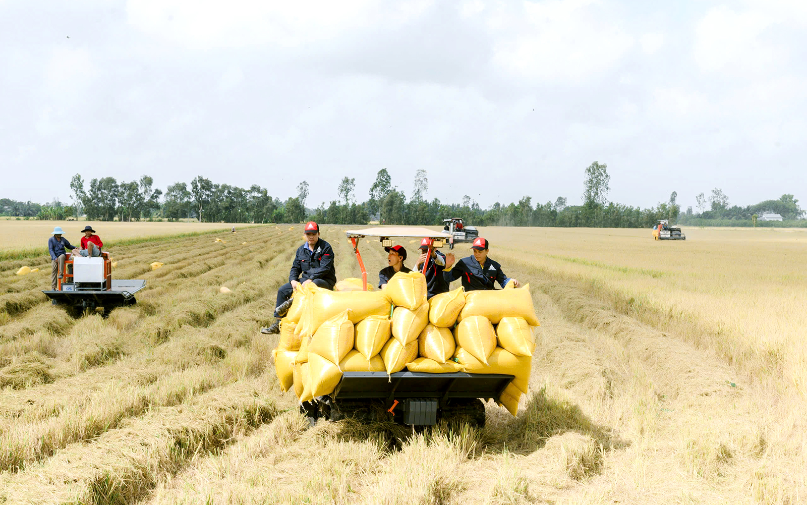 Nông dân xã Thạnh Lộc thu hoạch lúa.