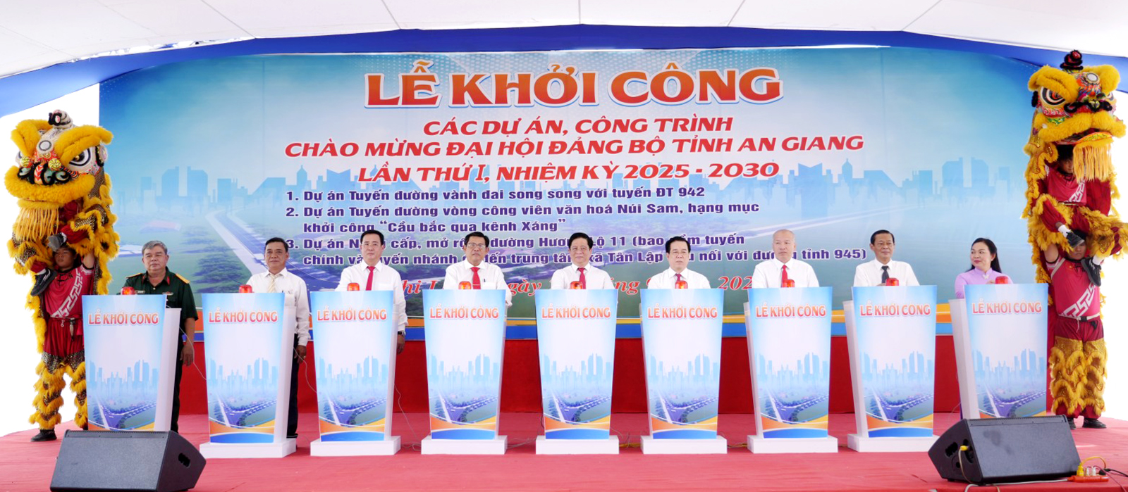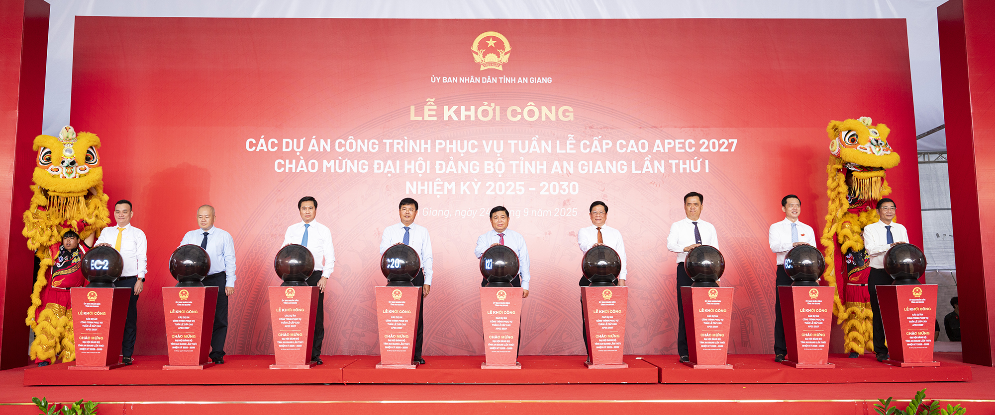 Phó Thủ tướng Chính phủ Nguyễn Chí Dũng (giữa) cùng lãnh đạo các bộ, ngành Trung ương, tỉnh An Giang cùng chủ đầu tư, nhà thầu thực hiện nghị thức khởi công, khởi động các dự án phục vụ Tuần lễ cấp cao APEC 2027.