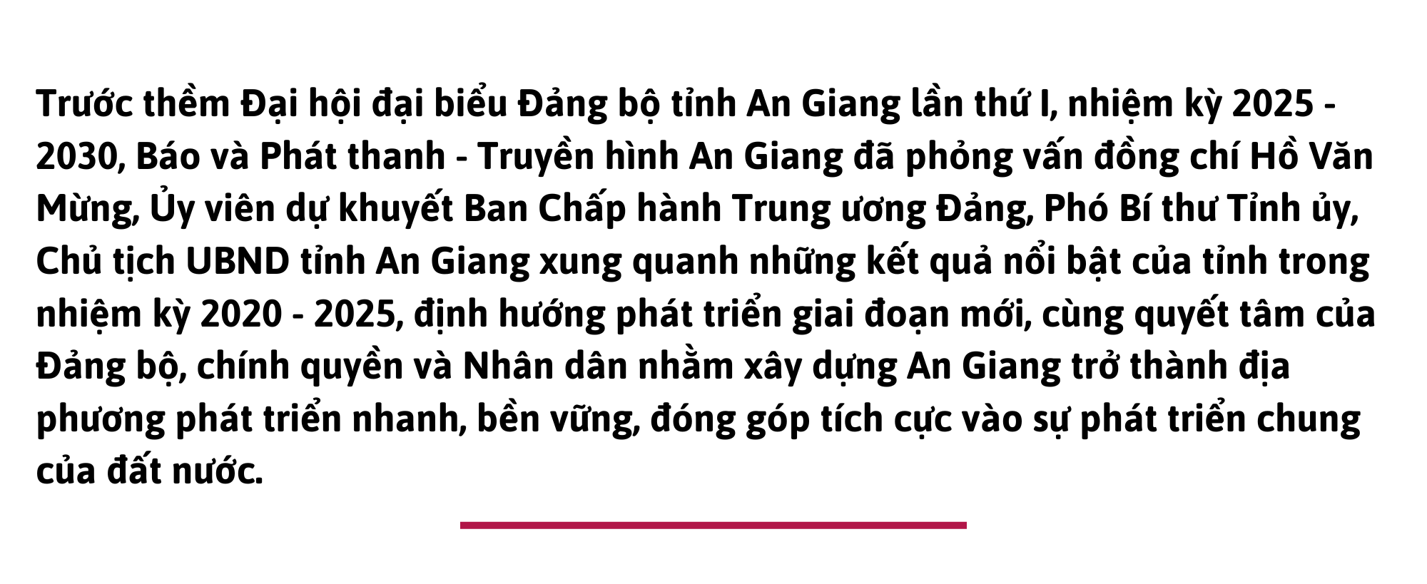 - Đồng chí Hồ Văn Mừng: Bước vào nhiệm kỳ 2025 - 2030, An Giang tràn đầy niềm tin và quyết tâm. Những thành tựu 5 năm qua đã khẳng định bản lĩnh, sự đoàn kết và sức vươn lên mạnh mẽ của Đảng bộ, chính quyền và nhân dân tỉnh nhà. Giai đoạn mới được xác định là cơ hội then chốt để mở ra cơ hội bứt phá và phát triển toàn diện. Tỉnh sẽ tập trung khai thác tối đa tiềm năng, lợi thế về vị trí, tài nguyên và con người, ưu tiên các nhiệm vụ trọng tâm, các khâu đột phá chiến lược; đồng thời, phát triển kinh tế phải gắn liền với nâng cao đời sống nhân dân, bảo vệ môi trường và đảm bảo bền vững về xã hội, quốc phòng, an ninh.