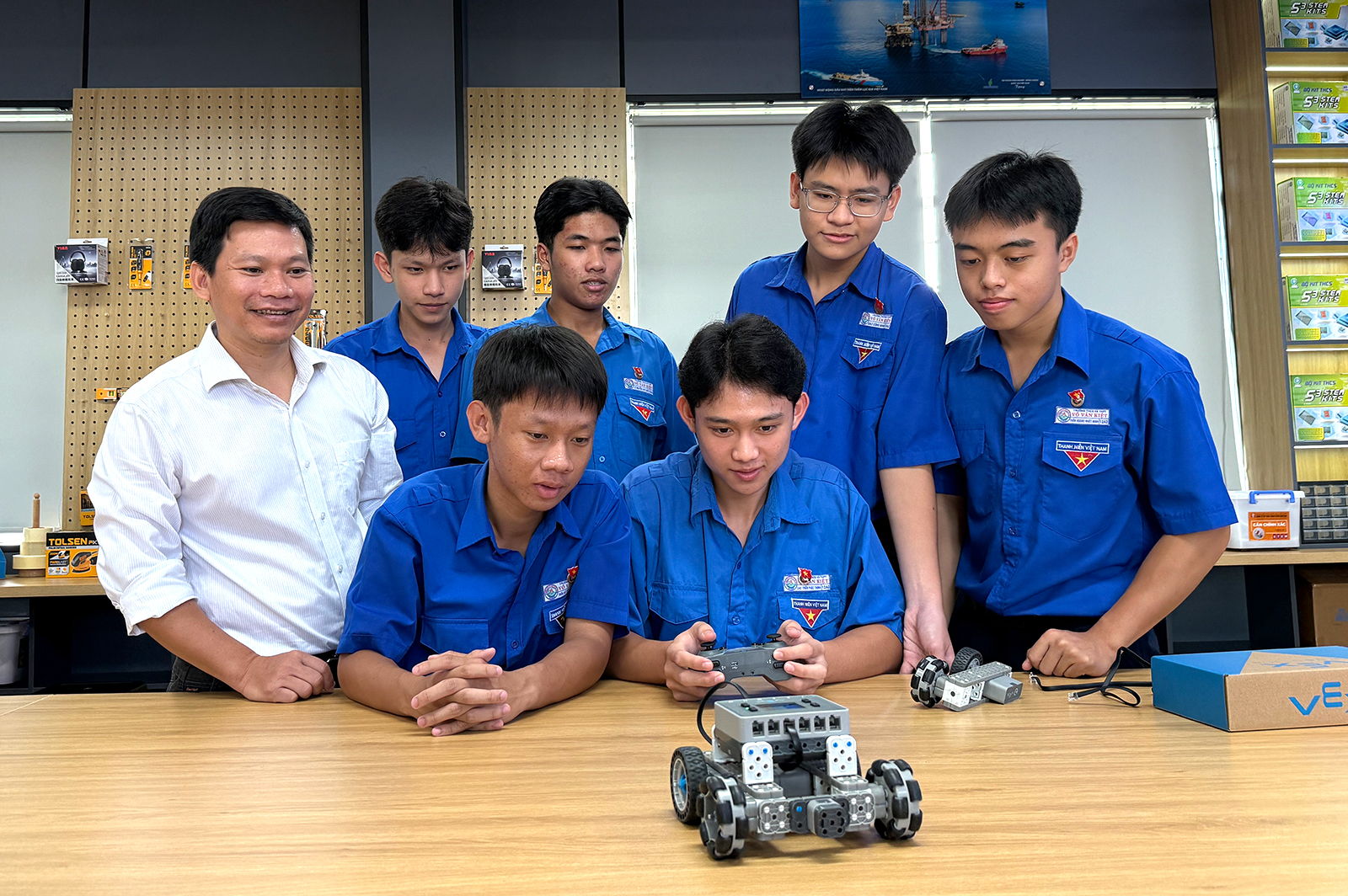 Thầy và trò Trường Trung học cơ sở và Trung học phổ thông Võ Văn Kiệt, phường Rạch Giá trong giờ thực hành tại phòng học STEM. Ảnh: BÍCH TUYỀN