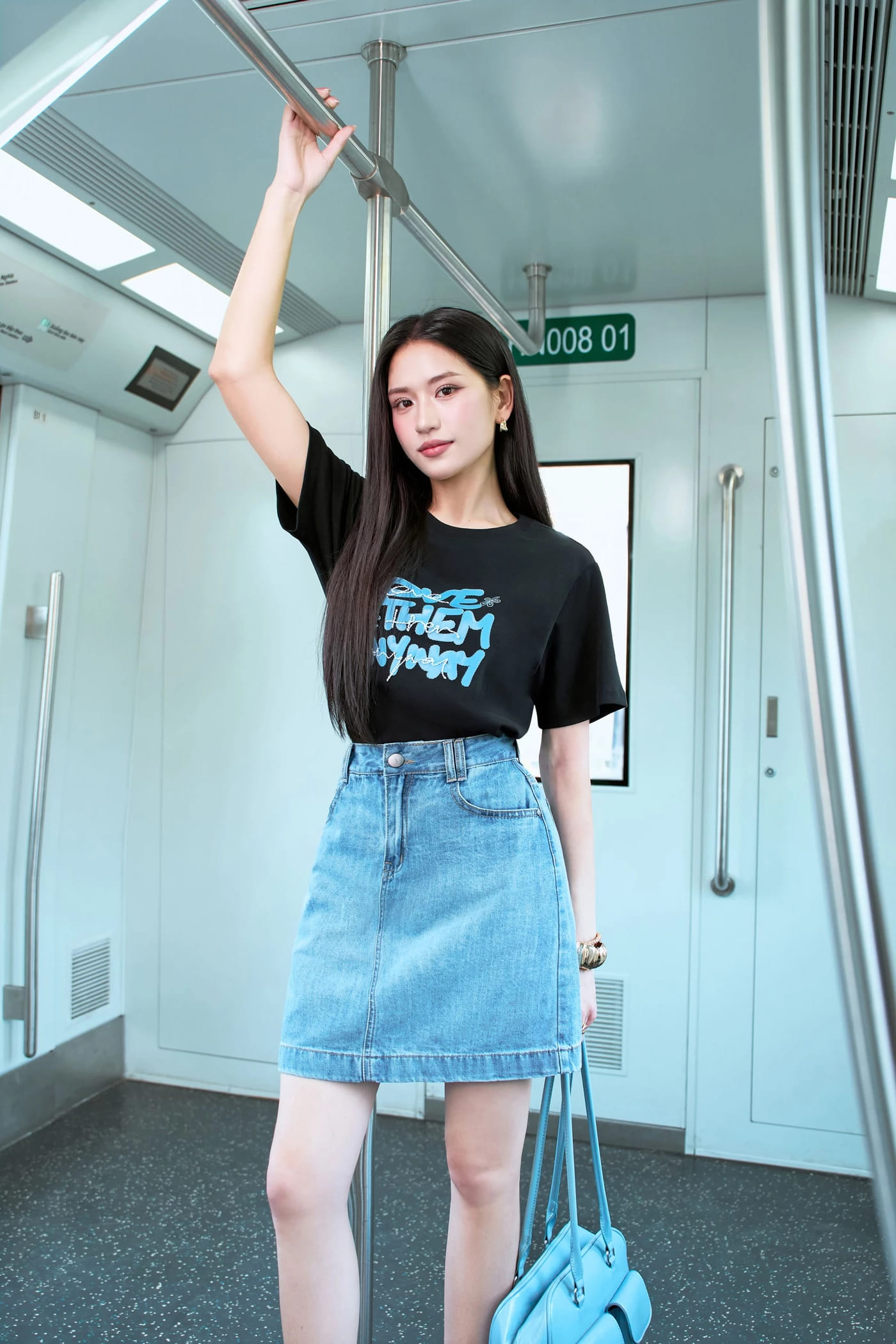 Chân váy jean dáng chữ A ôm nhẹ phần hông rồi mở rộng dần xuống gấu, chất denim xanh sáng mang hiệu ứng loang tự nhiên giúp đôi chân trông thon và dài hơn. Diện cùng áo thun cộc tay màu đen in họa tiết nổi, bộ đồ trở nên hiện đại và vô cùng khỏe khoắn.