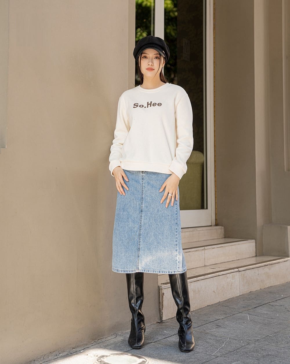 Chiếc chân váy jean dài suông với chất liệu denim dày, màu xanh nhạt loang nhẹ ở gấu tạo vẻ bụi bặm nhưng nhã nhặn. Váy che kín bắp chân, giúp vóc dáng cao ráo, thon gọn. Sánh đôi cùng áo thun trắng kem và bốt cao, bộ đồ đảm bảo vừa ấm áp vừa phóng khoáng.