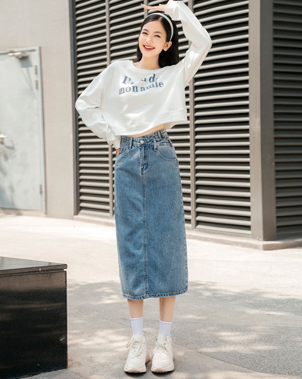 Chân váy jean dài thẳng màu xanh nhạt trẻ trung, cạp cao ôm eo, chất liệu đứng phom giúp vóc dáng gọn gàng và cao ráo. ẢNH: @TWENTY.FIVE