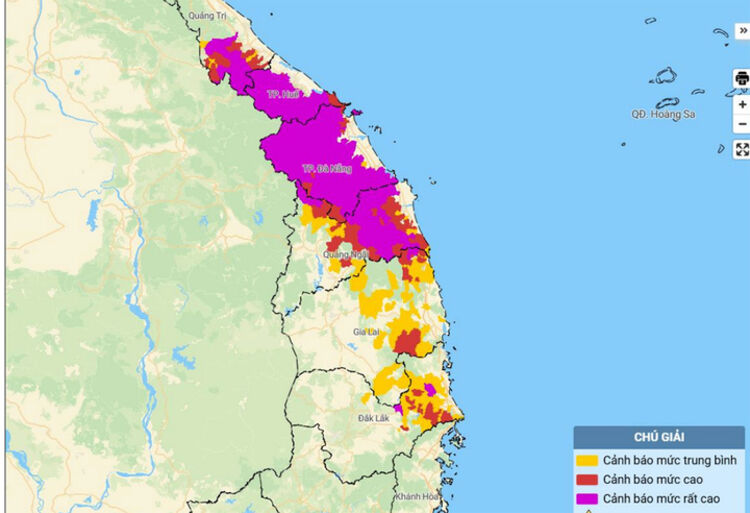 Cảnh báo rủi ro thiên tai do mưa lũ, lũ quét, sạt lở và sụt lún đất được xác định ở mức cấp 2 tại TP Đà Nẵng và cấp 3 tại TP Huế.