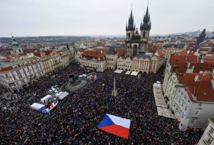 Người dân tụ tập tham gia một cuộc mít tinh đoàn kết tại trung tâm Praha nhằm bày tỏ sự ủng hộ đối với Tổng thống Petr Pavel. Ảnh: DPA