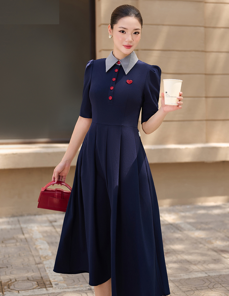 Đầm liền gam màu xanh đen phối cúc đỏ, chi tiết cổ xám cùng cài áo hình trái tim mang nét tươi vui, rạng rỡ cho bản phối công sở thường ngày. ẢNH: ORCHID