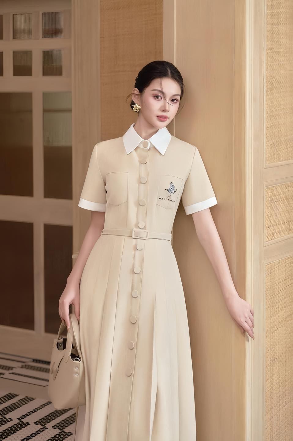 Thiết kế gợi nhắc tinh thần cổ điển, tối giản nhưng đậm chất sang chảnh. Chi tiết cúc bọc vải bản lớn, cổ phối màu trắng, tay ngắn và túi ngực cho thấy nét cá tính mạnh mẽ, hiện đại ẩn trong dáng vẻ thướt tha của trang phục. ẢNH: WHITE PLAN