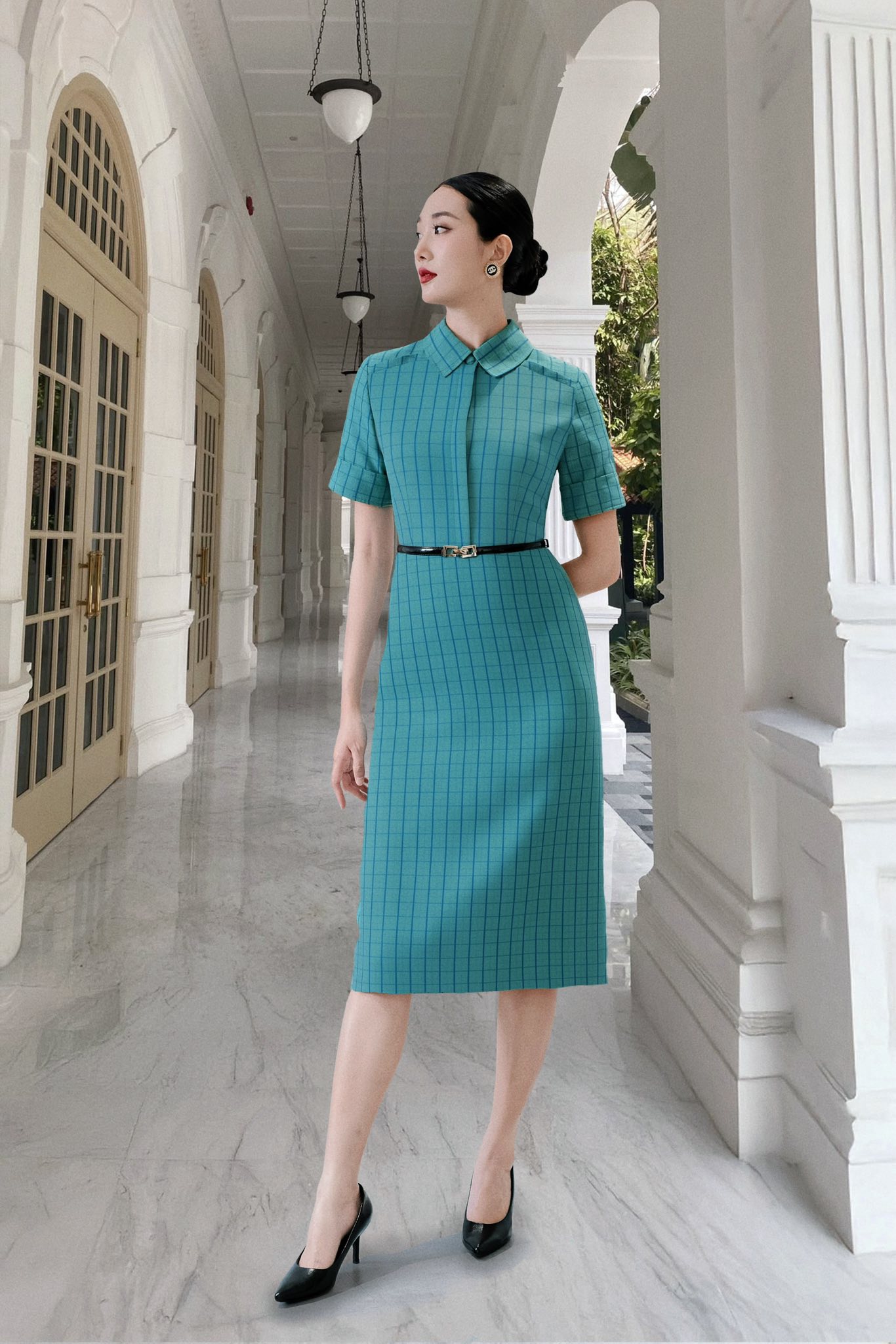 Họa tiết ca rô được tái hiện trên hai gam màu tươi tắn là xanh và tím, tạo nên hiệu ứng thị giác độc đáo . Váy midi phom dáng tối giản, đường cắt hiện đại ôm gọn cơ thể giúp mọi quý cô đều trở nên thanh lịch và duyên dáng. Đây chính là khởi nguồn của sự tự tin và phong thái hiện đại, trẻ trung. ẢNH: PREMIÈRE