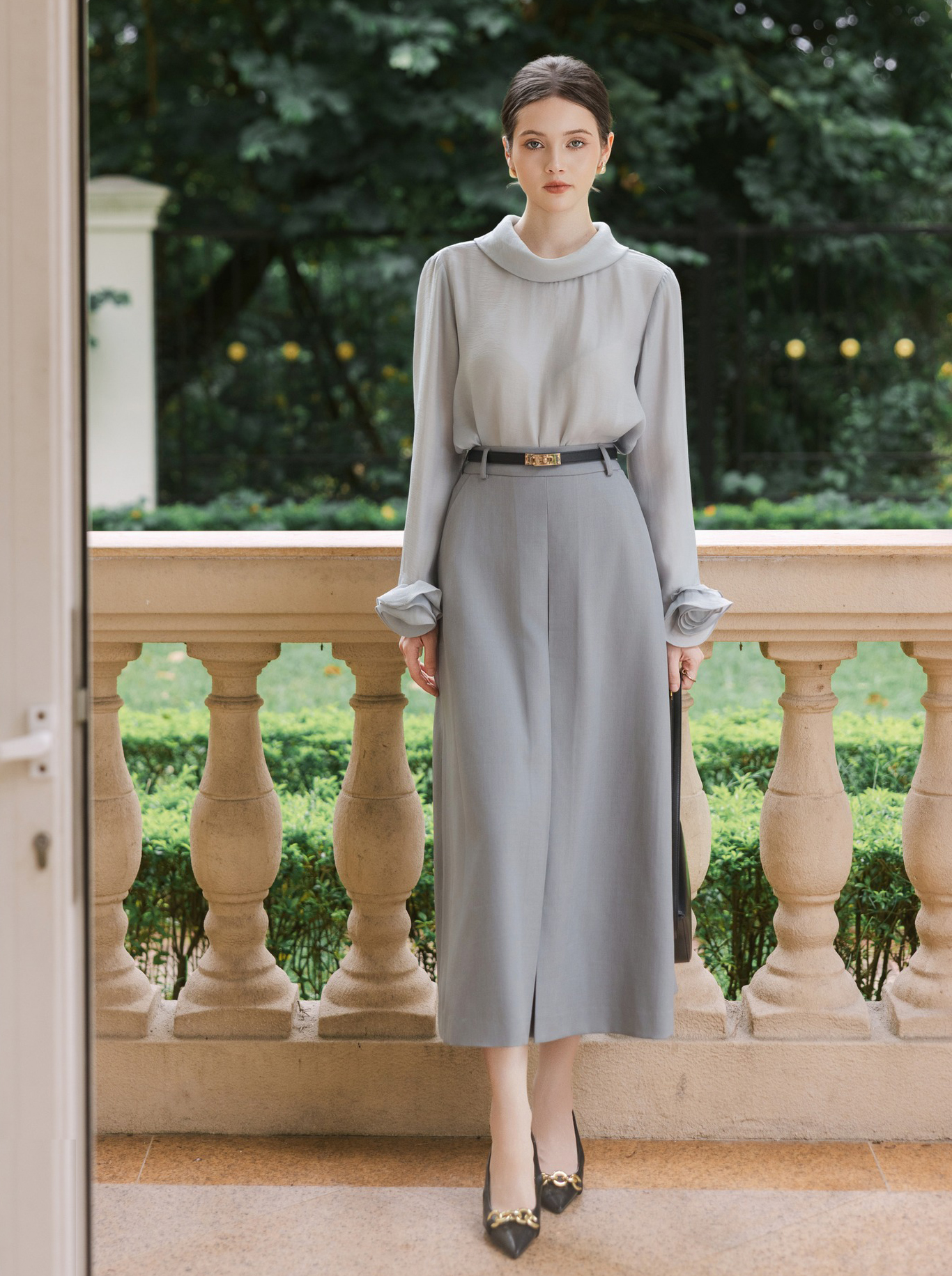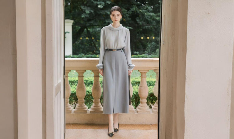 Gam màu ghi xám trong tủ đồ thu gợi lên cảm giác sang trọng, quý phái và trang nhã. Thiết kế có điểm nhấn hoa 3D trên hai tay áo, chi tiết cổ lật mềm mại, đường gấp nếp trên chân váy... đồng điệu và giàu nữ tính. ẢNH: MERNE