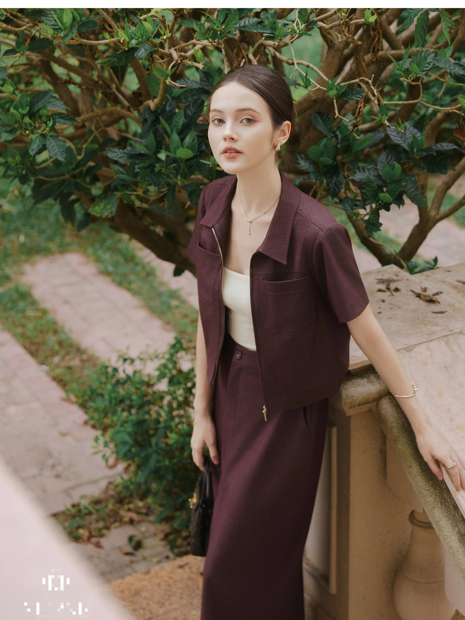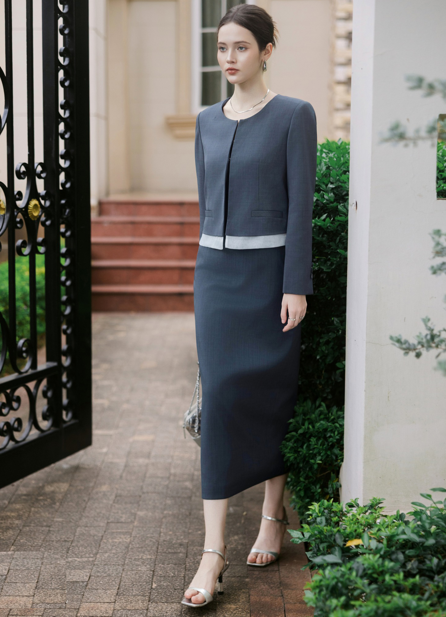 Lựa chọn cho phong cách công sở thời thượng mùa này là bản phối với chân váy bút chì và áo crop tay dài điểm chi tiết phối vải trắng. ẢNH: MERNE