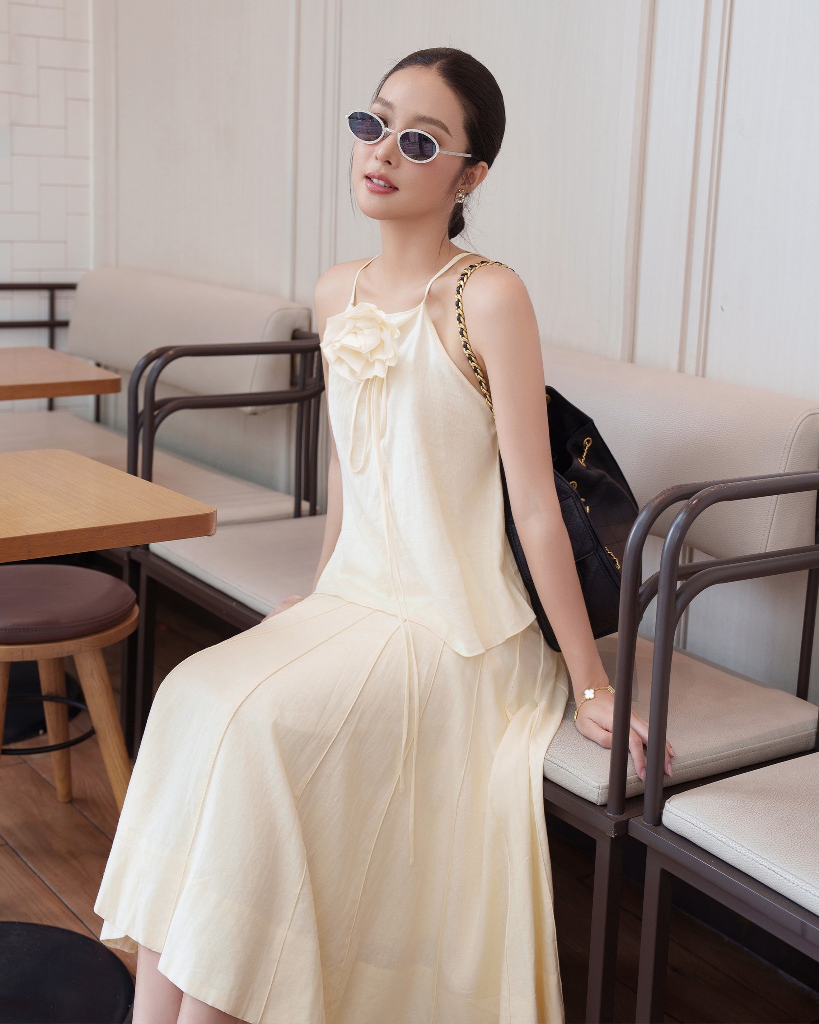 Chân váy midi phối áo yếm buộc dây đính hoa tôn bờ vai gầy mảnh mai cùng nàng dạo phố, hẹn hò cuối tuần hay thong thả tận hưởng ngày nghỉ thảnh thơi. ẢNH: KCLOSET