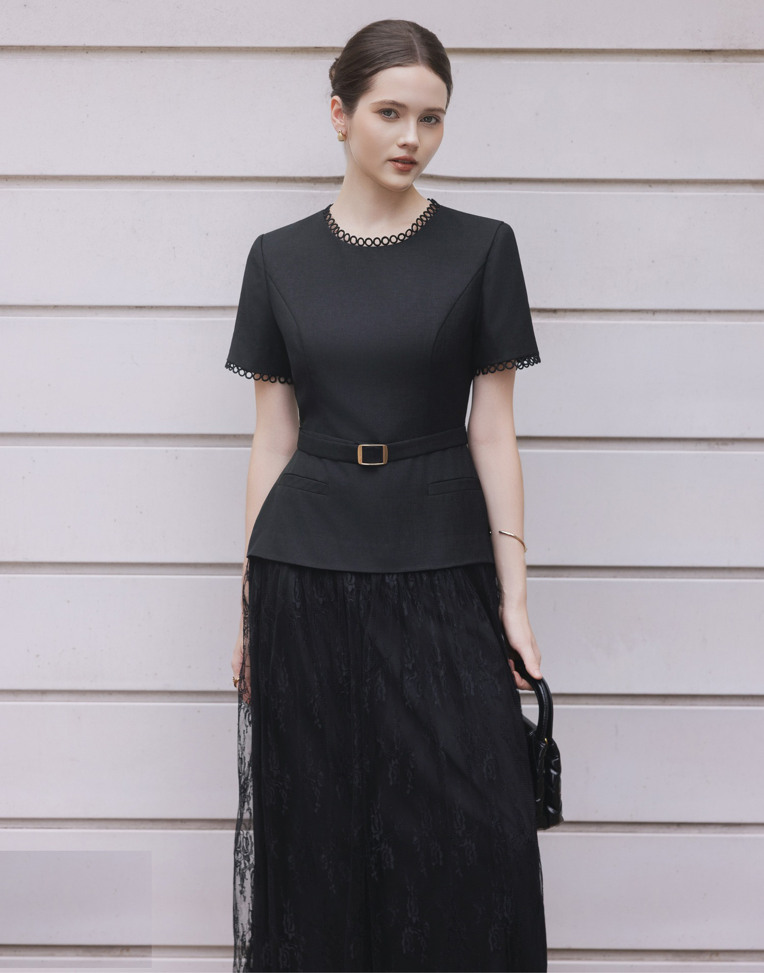 Không có nhiều sự tương đồng giữa áo và chân váy trong bản phối màu đen, tuy nhiên chi tiết viền đăng ten ở phần cổ và tay áo phù hợp với họa tiết ẩn hiện trên chân váy. Phụ kiện dây lưng, túi xách cầm tay cũng góp phần tạo nên diện mạo đáng nhớ cho bản phối. ẢNH: MERNE