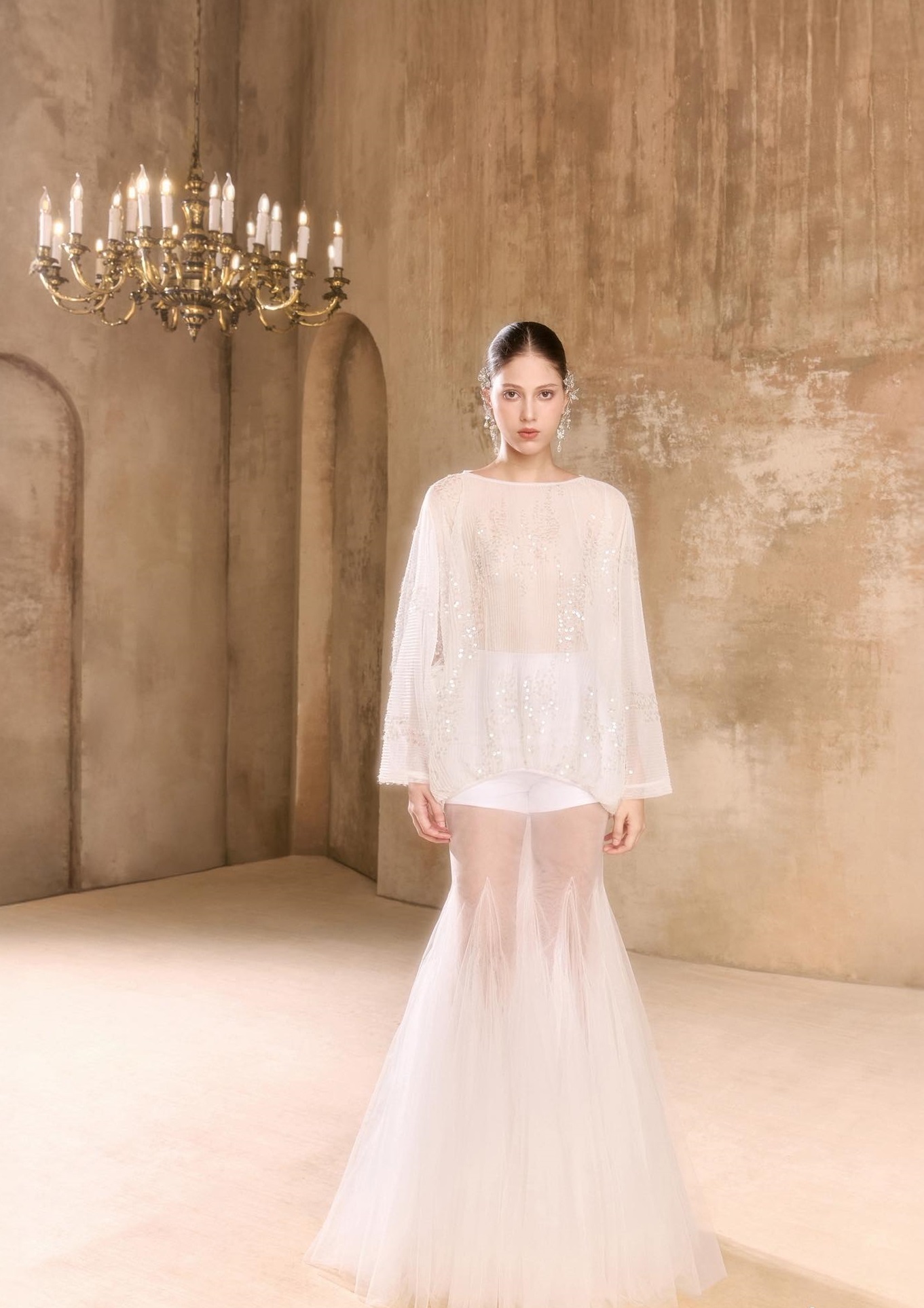 Vẻ đẹp được tỏa sáng từ sự tinh khiết của chất liệu, ánh nhìn bề mặt và chuyển động phom dáng. Được xử lý trên nền chất liệu tulle xuyên mỏng, đính ngẫu hứng sequins, thiết kế buông nhẹ, mềm mại tạo hiệu ứng dịu dàng. ẢNH: ARTI APPAREL