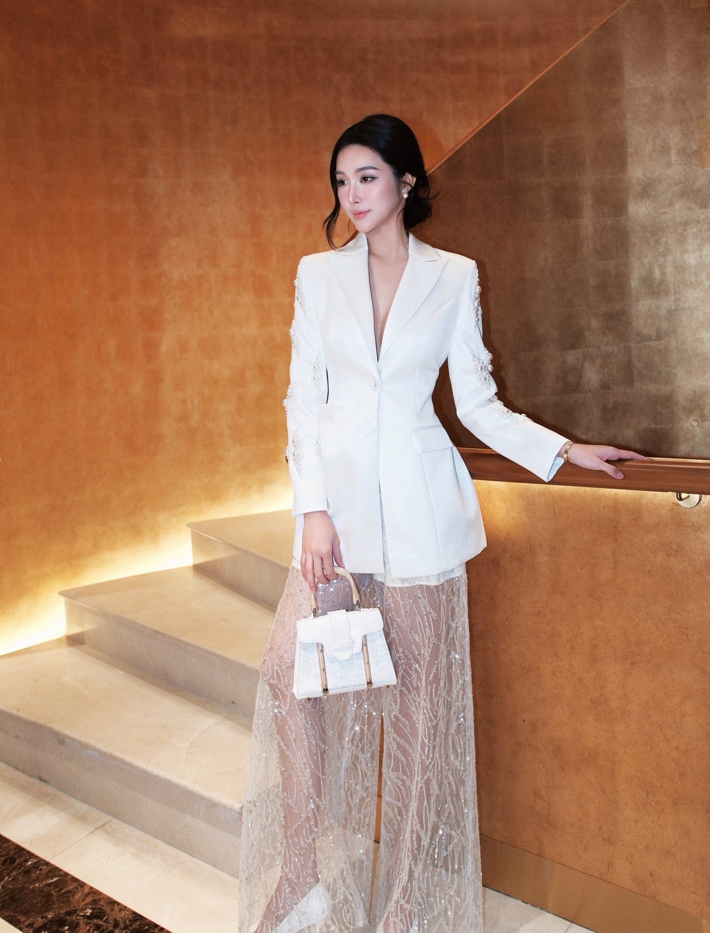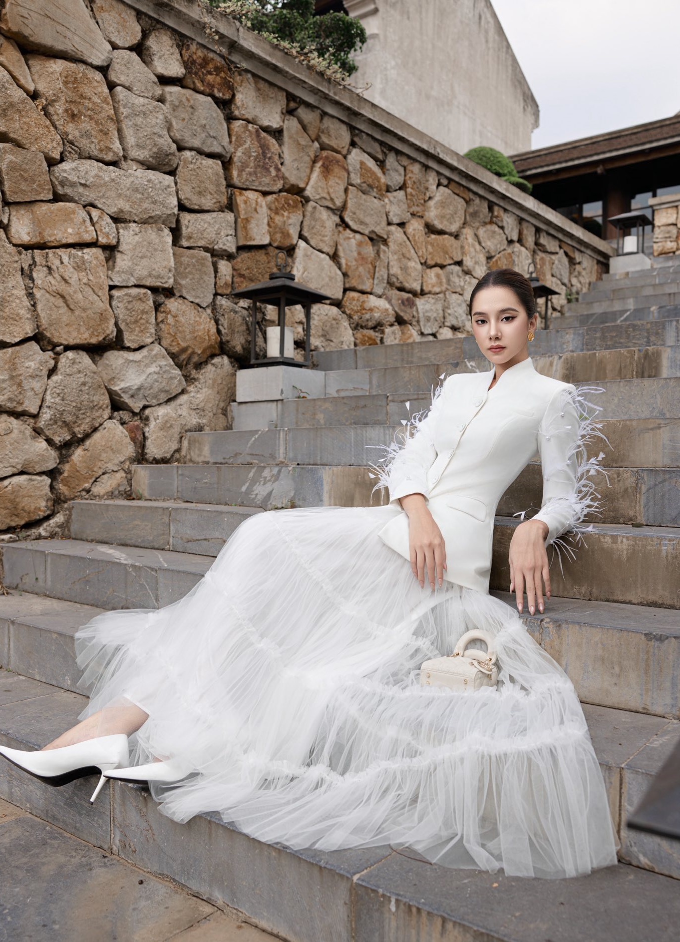 Áo blazer với hàng lông vũ trắng đính ngọc trai là điểm nhấn đặc biệt. Kết hợp chân váy midi xếp tầng với độ xuyên thấu vừa phải trông thật nữ tính chính là item cân bằng lại sự lãng mạn cho tổng thể. ẢNH: ARTI APPAREL