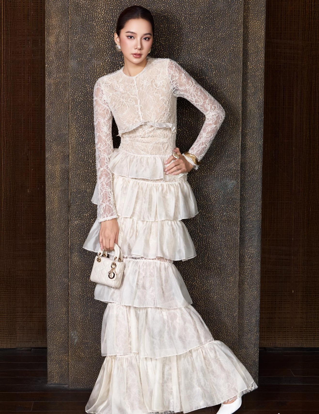 Cấu trúc và phom dáng được thiết kế tỉ mỉ để dựng phom như những cánh hoa mềm mại đang bung nở, vờn đùa trong gió sớm. Chất liệu ren hoa phối tơ xuyên thấu mờ nhẹ chính là sự tính toán hoàn hảo cho hiệu ứng thị giác nổi bật. ẢNH: ARTI APPAREL