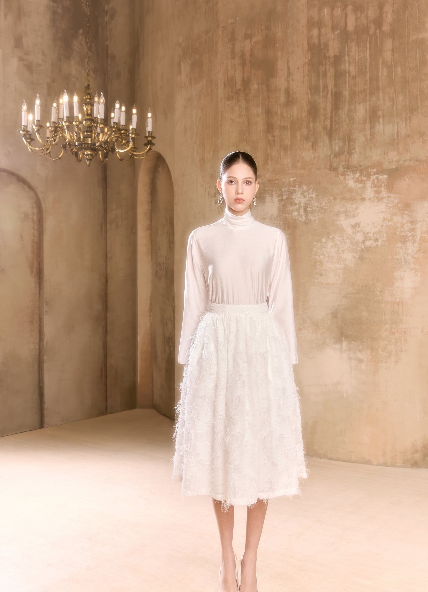 Chân váy lụa có bề mặt vải được dệt nổi bằng những đường vân hoa mềm mại, ẩn hiện dưới lớp ánh sáng, tạo nên hiệu ứng thị giác trong trẻo. Khi kết hợp cùng áo sheer cổ cao thanh thoát, tổng thể trở nên cân bằng. ẢNH: ARTI APPAREL