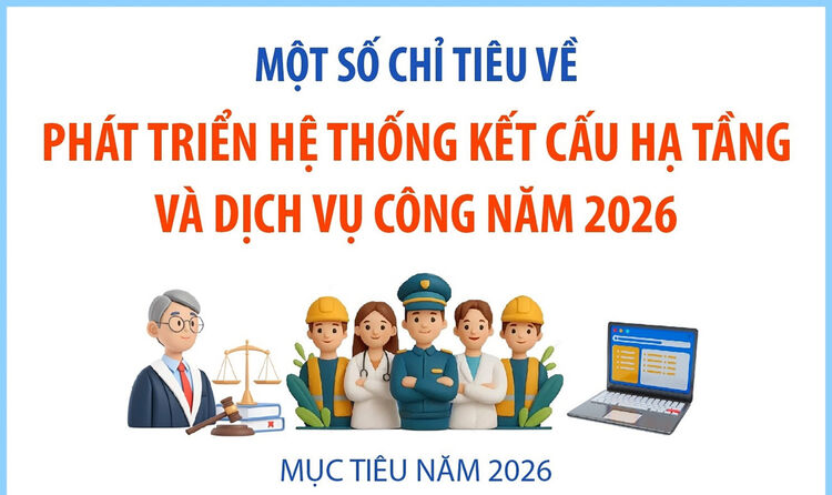 Tại Phụ lục IV kèm theo Nghị quyết, Chính phủ đặt ra chỉ tiêu về phát triển hệ thống kết cấu hạ tầng và dịch vụ công năm 2026, trong đó có các chỉ tiêu như: tỷ lệ hộ gia đình có cáp quang là 84%; diện tích nhà ở bình quân cả nước đạt 27m2sàn/người; hơn 110.000 căn nhà ở xã hội được hoàn thành; tỷ lệ đô thị hóa toàn quốc đạt 45%...