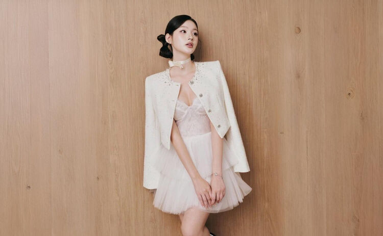 Áo khoác tweed ngắn được cắt cúp chuẩn xác, giữ phom đứng nhưng vẫn mềm mại với ánh nhũ tinh tế. Khi phối cùng váy cổ yếm, đường cong được tôn lên nhẹ nhàng. Điểm nhấn nơ lụa đính thủ công mang đến sự ấn tượng. ẢNH: FLANE