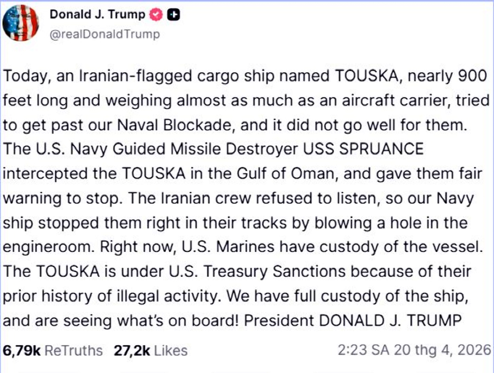 Trong một bài đăng trên mạng xã hội Truth Social, Tổng thống Trump cho biết tàu chở hàng dài khoảng 275m mang tên TOUSKA đã bị tàu khu trục Hải quân USS Spruance chặn lại tại Vịnh Oman sau khi phớt lờ cảnh báo dừng lại. Ông Trump nêu rõ con tàu đã bị vô hiệu hóa và hiện thủy quân lục chiến Mỹ đang nắm quyền kiểm soát tàu. Iran chưa đưa ra bình luận công khai về vụ bắt giữ tàu này.