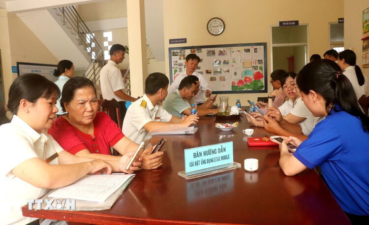 Cán bộ ngành thuế hướng dẫn người dân cài đặt ứng dụng eTax Mobile. (Ảnh: Thu Hiền/TTXVN)