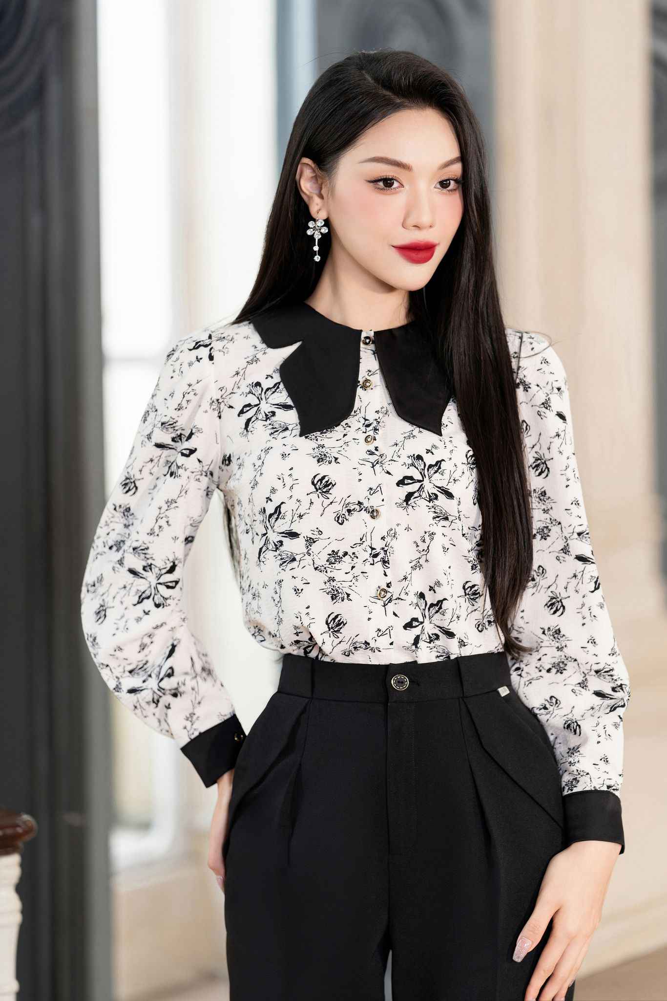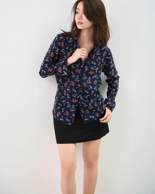 Nếu họa tiết hoa lá bản lớn mang đến cảm giác phóng khoáng, thì hoa nhỏ lại chinh phục phái đẹp bằng vẻ dịu dàng và tinh tế rất riêng. Áo sơ mi cổ bẻ nổi bật với những bông hoa kích thước khác nhau được sắp xếp hài hòa trên nền vải. Phom áo gọn gàng, đường cắt tinh tế giúp vóc dáng người mặc trở nên thanh thoát và nữ tính hơn.