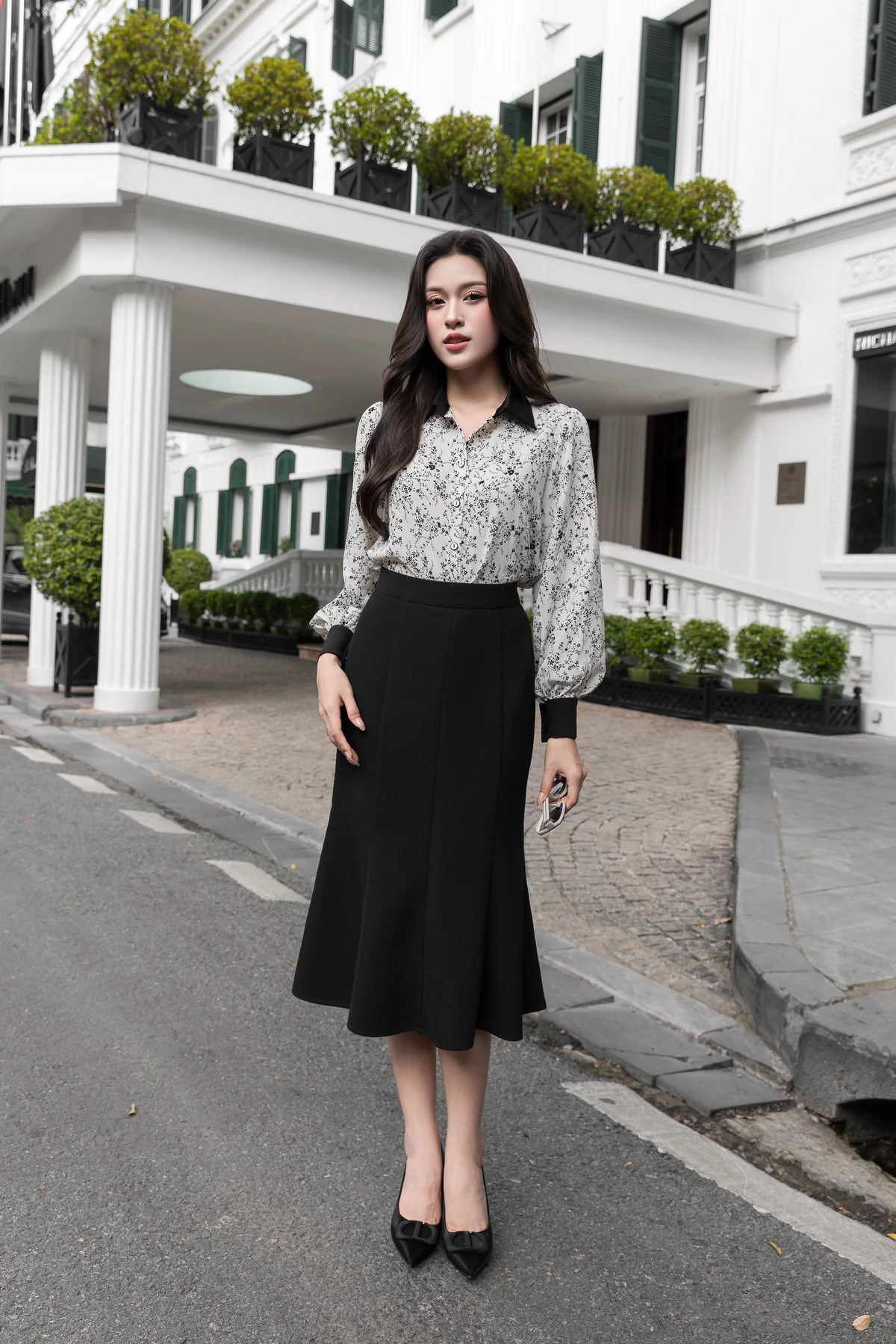 Với những buổi gặp cần sự chỉn chu, áo họa tiết hoa lá kết hợp cùng chân váy dài sẽ giúp diện mạo thêm phần chuyên nghiệp. ẢNH: K&K FASHION