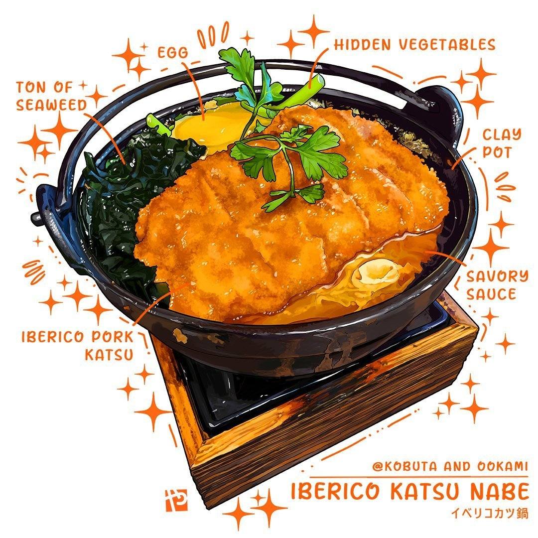 Lẩu katsu thịt heo Iberico, món Nhật Bản với thịt heo Iberico tẩm bột chiên xù, nấu trong nồi đất cùng trứng, rong biển, rau củ và xốt mặn ngọt, ăn nóng tại bàn - Ảnh: @itadaki_yasu