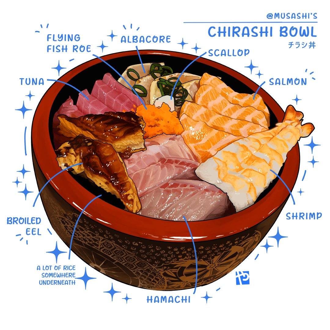 Món cơm chirashi (cơm hải sản Nhật Bản), bát cơm sushi phủ nhiều loại hải sản sống như cá hồi, cá ngừ, sò điệp, tôm, trứng cá và lươn nướng - món ăn phổ biến trong ẩm thực Nhật - Ảnh: @itadaki_yasu