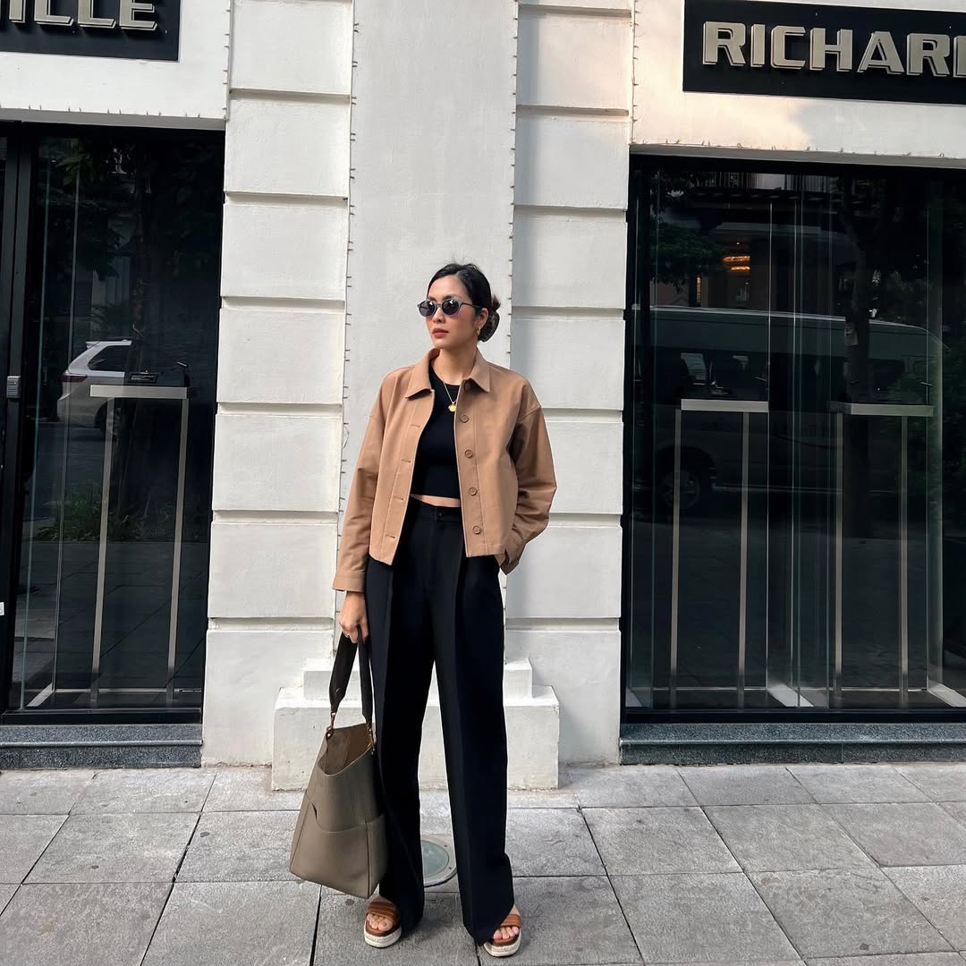 Áo khoác dáng hộp với sắc camel không chỉ đóng vai trò thị giác mà còn tạo nên chiều sâu phong cách. Áo khoác được cắt gọn, vai đứng nhẹ và gần như không có chi tiết trang trí thừa. Bên trong, áo đen đóng vai trò làm nền, giúp bảng màu trở nên thống nhất với quần ống suông đen có độ dài chạm nhẹ giày tạo hiệu ứng kéo dài dáng rõ rệt. ẢNH: @HATANGTHANH