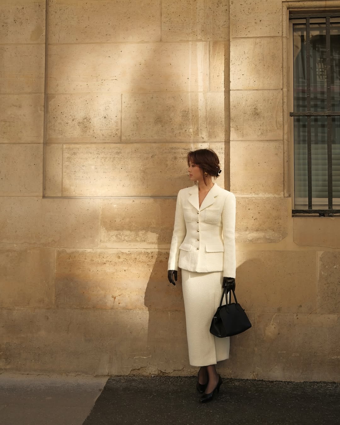 Chất liệu tweed từ lâu đã trở thành biểu tượng của sự sang trọng cổ điển. Khi xuất hiện trong set suit màu kem, tweed không chỉ tạo cấu trúc cho trang phục mà còn mang lại cảm giác dày dặn. Áo được chiết eo nhẹ giúp tôn dáng một cách tự nhiên, tránh cảm giác cứng nhắc thường thấy ở suit truyền thống. ẢNH: @KLINHND