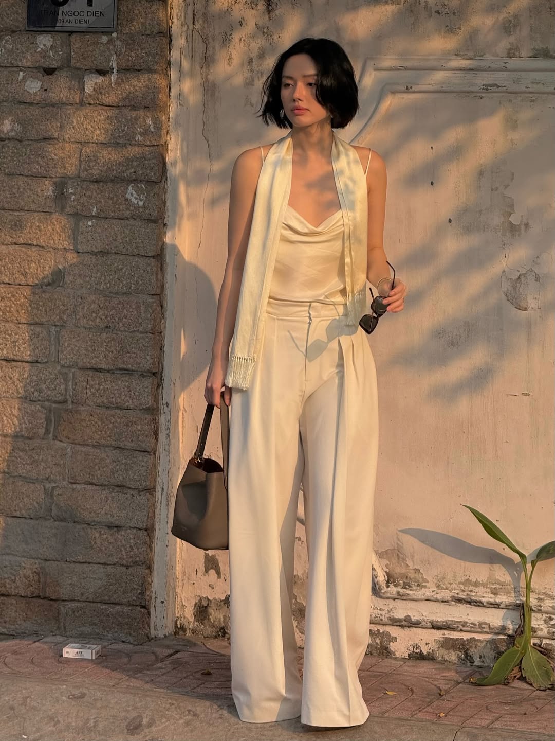 Chất lụa satin xuất hiện với độ rũ tự nhiên, áo hai dây cổ đổ mang nét quyến rũ, nhưng được cân bằng lại bằng quần ống rộng cạp cao. Điểm quan trọng nằm ở phom quần đứng, vẫn có cấu trúc không bị mềm nhão theo chất vải. ẢNH: @KLINHND