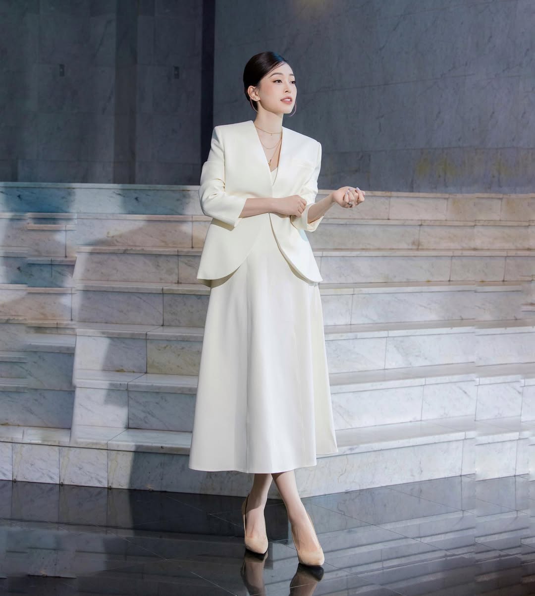 Có những bản phối không bao giờ lỗi thời, và blazer trắng kết hợp chân váy midi chính là một trong số đó. Áo blazer phom chuẩn với phần vai đứng nhẹ giúp tạo nên phom dáng thanh lịch cho người mặc. Khi kết hợp cùng chân váy midi xòe vừa phải, tổng thể trở nên cân đối và hài hòa theo đúng chuẩn mực cổ điển. ẢNH: @PHUONGNGABUI_