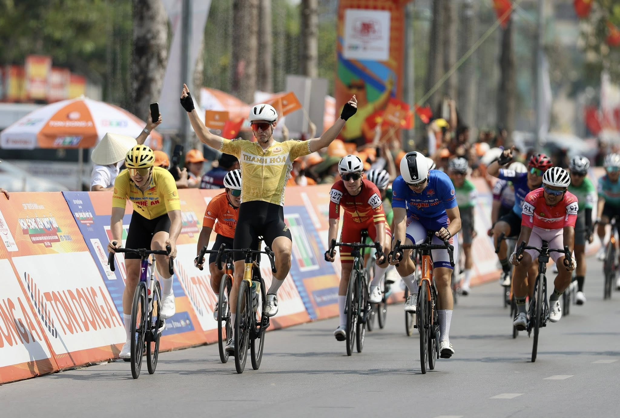 Anton Popov ăn mừng tại vạch đích sau khi thắng chặng 6 - Ảnh: CYCLING NEWS