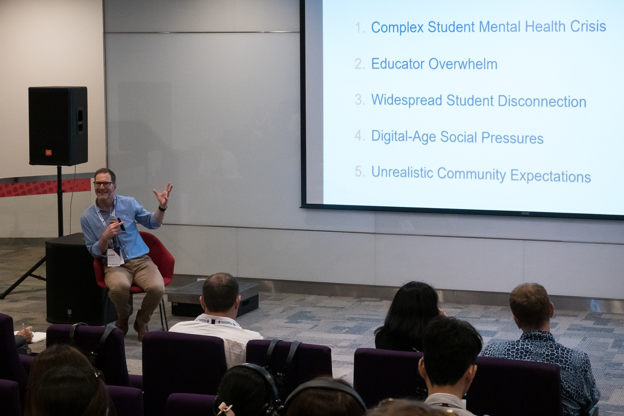 Ông Justin Robinson nêu các thách thức mà nhà giáo dục phải đối mặt trong bối cảnh hiện nay, từ bản thân học sinh tới kỳ vọng của xã hội đương đại. ẢNH: NGỌC LONG