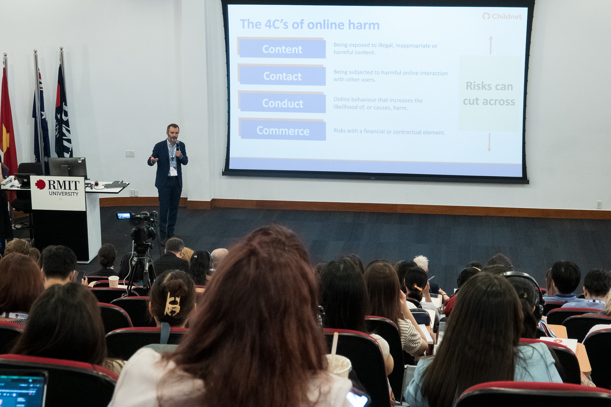 Ông Will Gardner phân loại hiểm nguy trên không gian số theo khung "4C", gồm nội dung độc hại (content), tương tác nguy hiểm (contact), hành vi trực tuyến gây hại (conduct) và rủi ro tài chính (commerce). ẢNH: NGỌC LONG