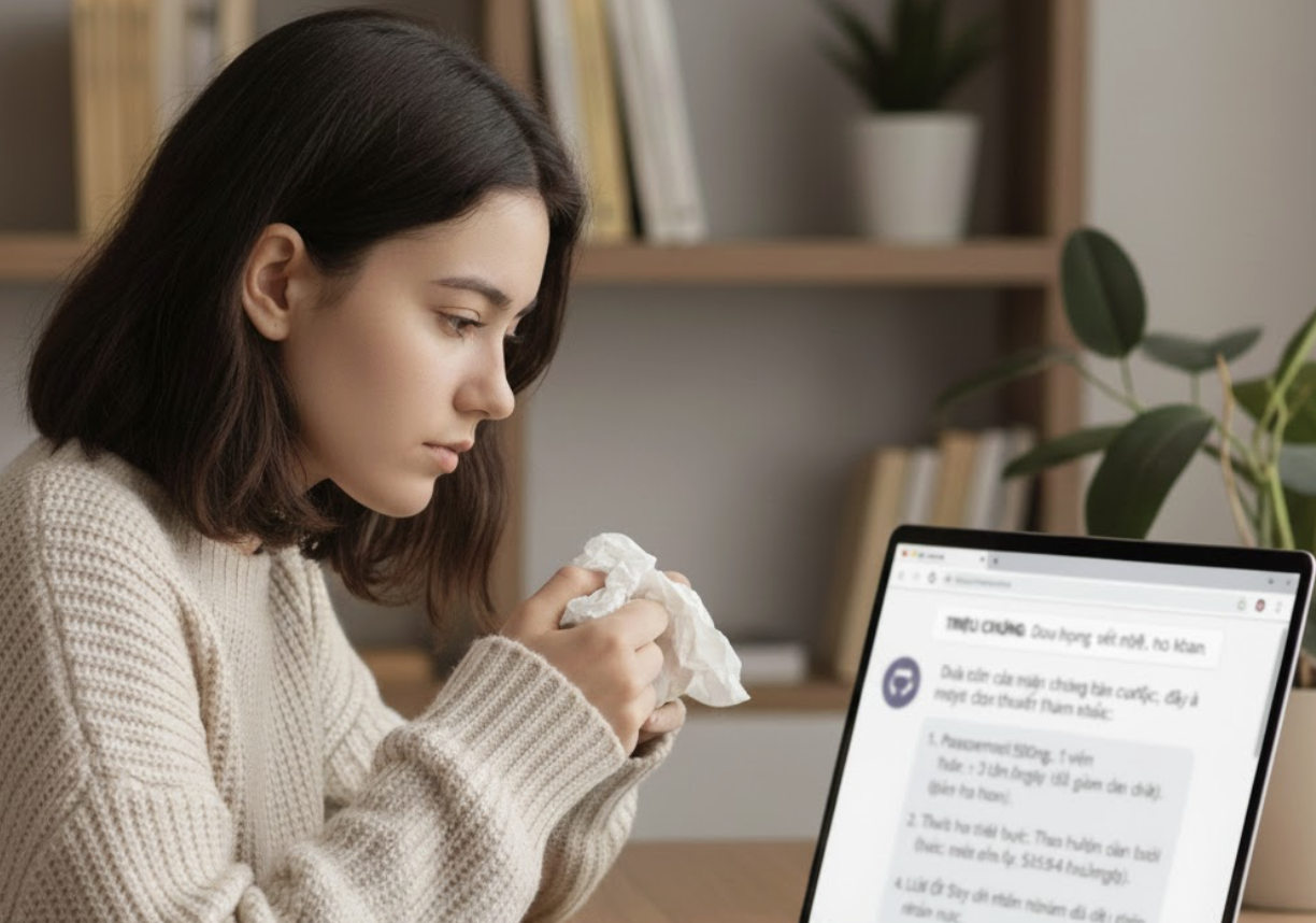 Thấy nghẹt mũi, đau đầu, ho khan 3 ngày, chị L. (34 tuổi) đã hỏi ChatGPT: "Tôi bị ho và nghẹt mũi, dùng thuốc gì thì nhanh khỏi?". Chị nhận được thông tin tư vấn: "Thông thường cảm lạnh có thể dùng thuốc giảm triệu chứng như thuốc ho thảo dược hoặc thuốc xịt mũi ngắn ngày", chị L. làm theo.