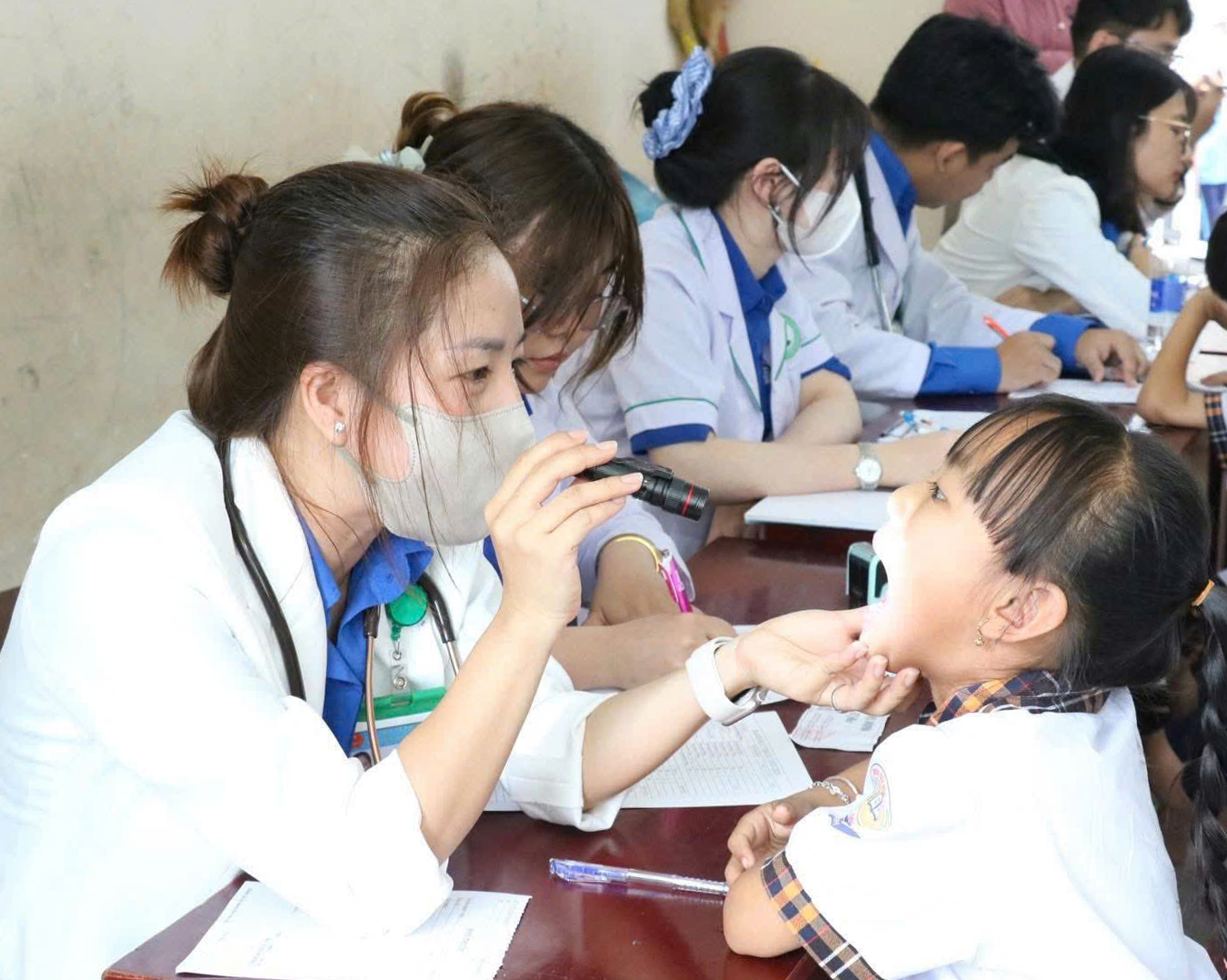 Đoàn Thanh niên Ủy ban nhân dân tỉnh tổ chức khám bệnh, cấp phát thuốc miễn phí cho trẻ em. Ảnh: MI NI