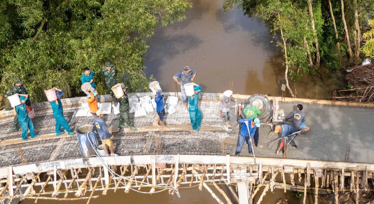 Sáng sớm, trên công trường, những người lính trong màu áo xanh cùng đoàn viên, thanh niên, dân quân và bà con đã bắt tay vào việc. Người trộn bê tông, người vác sắt, người đổ cát, đổ đá… ai cũng làm việc khẩn trương, nhịp nhàng. Mồ hôi đẫm áo, nhưng niềm vui vẫn ánh lên trong từng nụ cười. Niềm vui ấy đến từ sự sẻ chia, từ ý nghĩ rằng công sức hôm nay sẽ giúp người dân mai sau đi lại thuận tiện, an toàn hơn.