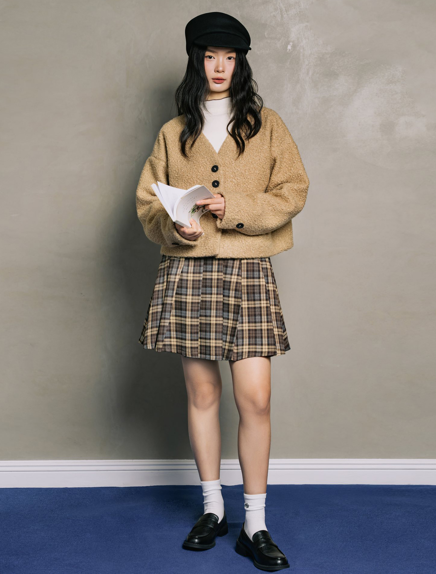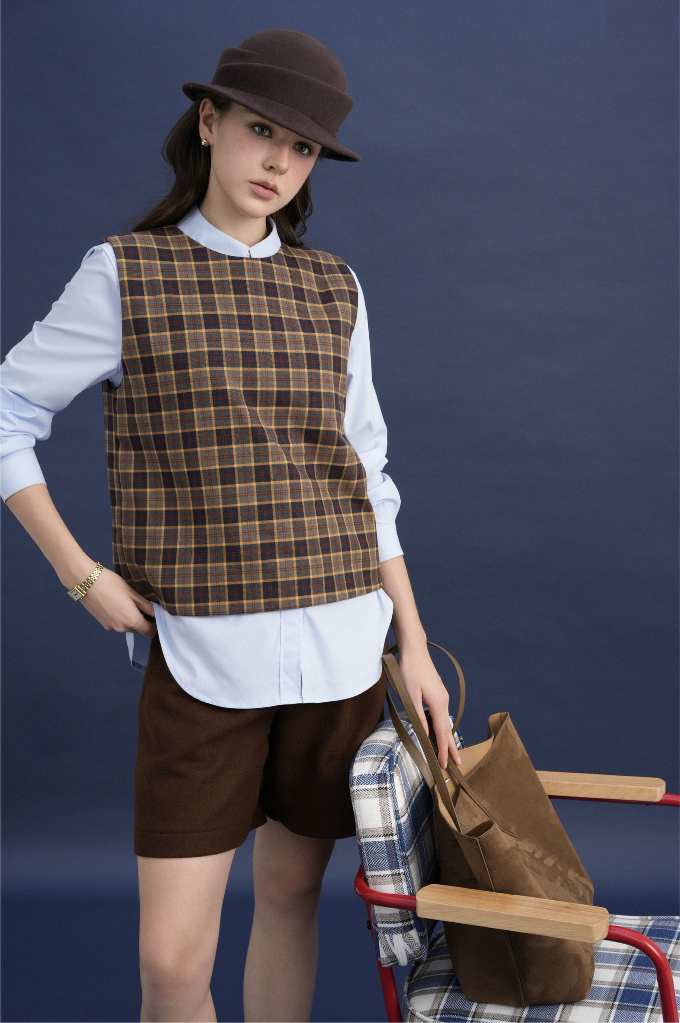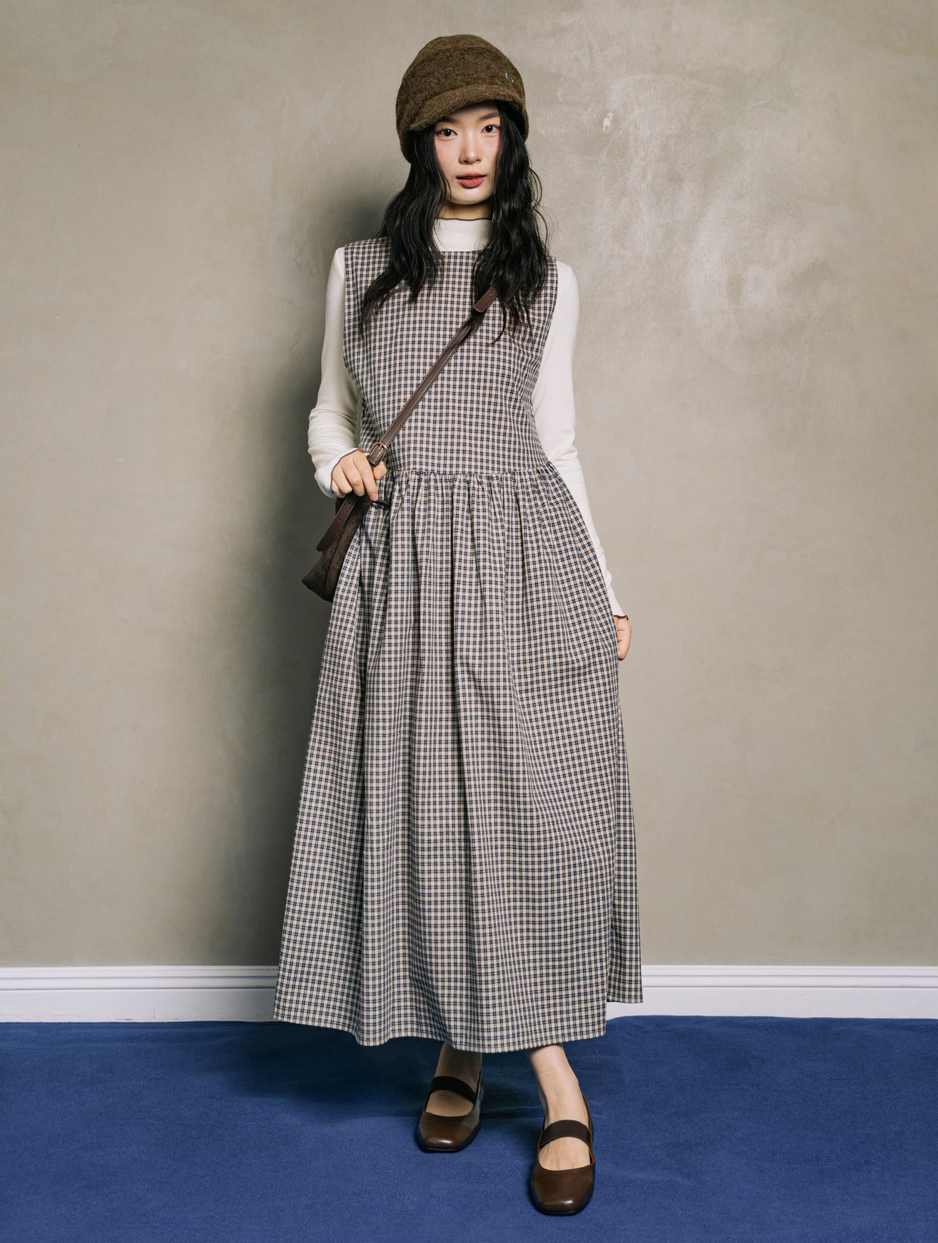 Tạo nên dáng vẻ nhẹ nhàng và thanh thoát cho bản phối nhờ cách phối đồ khéo léo từ bảng màu đến phom dáng. Áo dệt kim mỏng tay dài giúp giữ nhiệt, bảo vệ cơ thể trong mùa lạnh nhưng đồng thời tạo nên phom dáng đẹp "làm nền" cho váy midi kẻ ca rô. ẢNH: MAEVE
