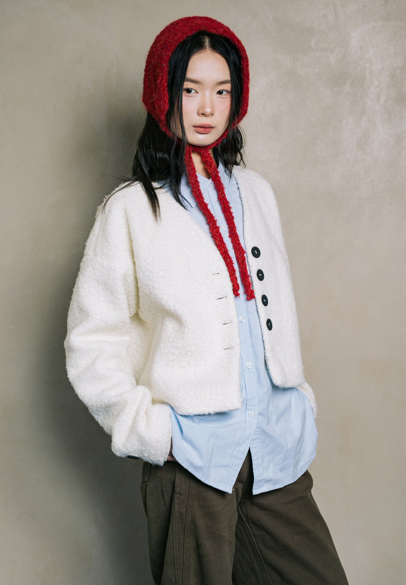 Cặp đôi quần kaki/denim tông xanh rêu và sơ mi xanh oversized trở nên cá tính và dễ thương hơn khi được kết hợp cùng cardigan dáng ngắn và mũ len. Hai món đồ len sợi lông xù với hai gam màu nổi bật giúp bản phối thăng hoa mãn nhãn. ẢNH: MAEVE