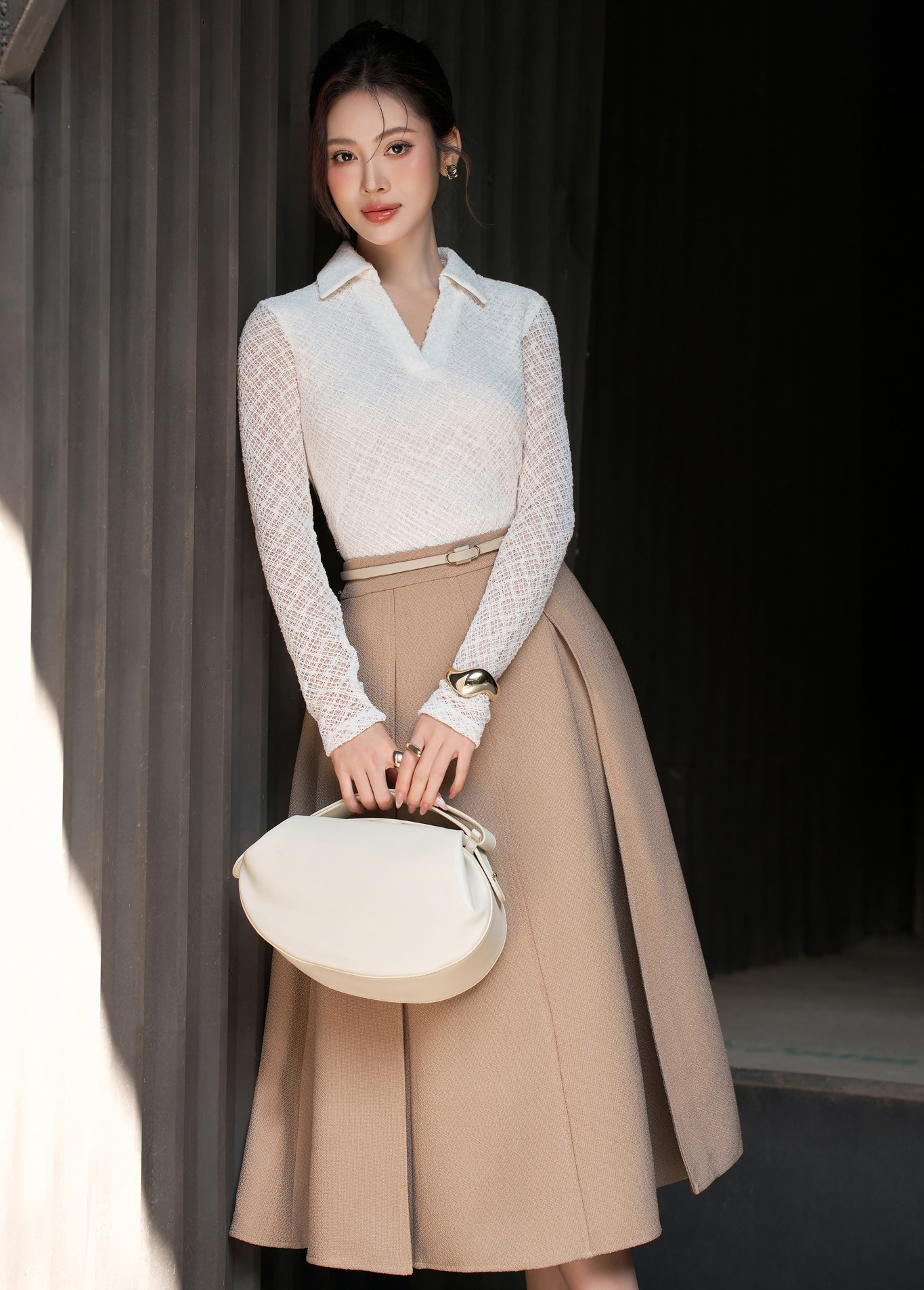 Bản phối mang tông trắng kem và nâu be hoàn hảo trong việc tạo ra hình ảnh vừa trang nhã, chuyên nghiệp mà vẫn thời thượng đầy khí chất. Dáng váy xếp nếp xòe nhẹ tạo dáng quả chuông, qua đó tôn đường cong thắt eo mà vẫn cho nàng sự thả lỏng thư thái, thỏa sức cho nhịp sống bận rộn. ẢNH: IVY MODA