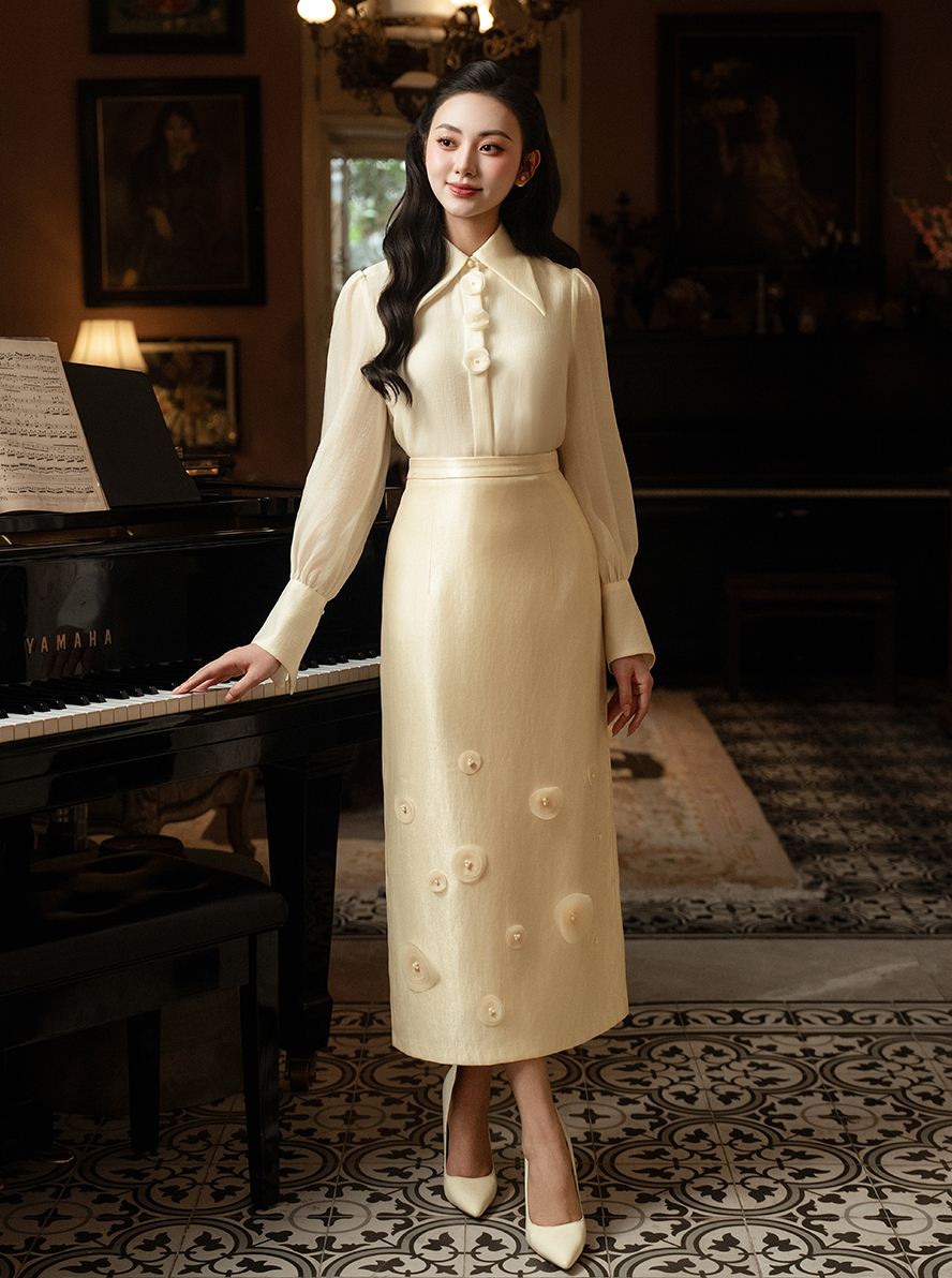 Sơ mi nhấn eo phối chân váy chữ A xếp ly xinh xắn và giày cao gót quai mảnh để nàng diện cả trong dịp tết lẫn ngày đi làm công sở bình thường. Tông màu trung tính hài hòa, tôn da và mang đến cảm giác thân thiện. ẢNH: GUMAC