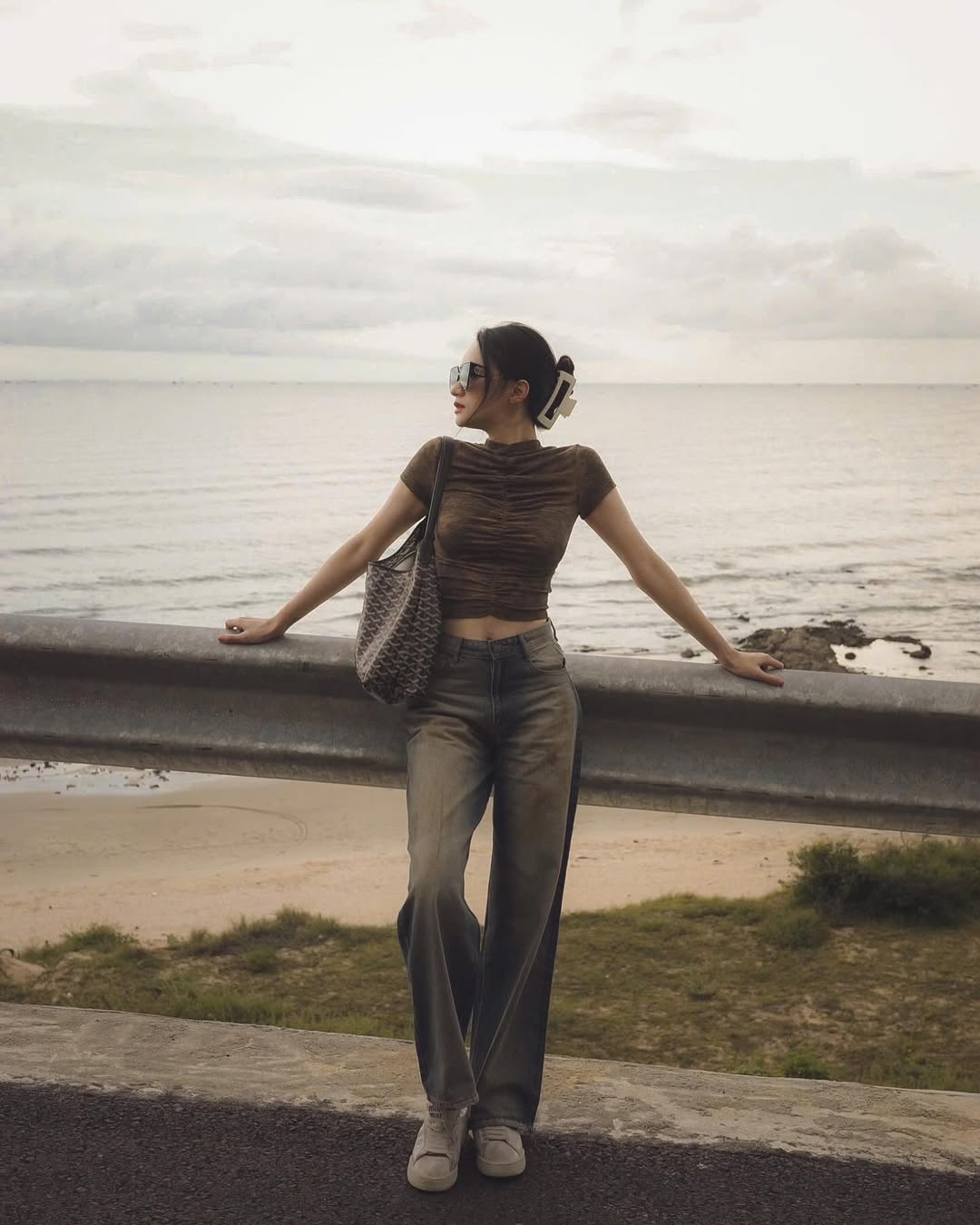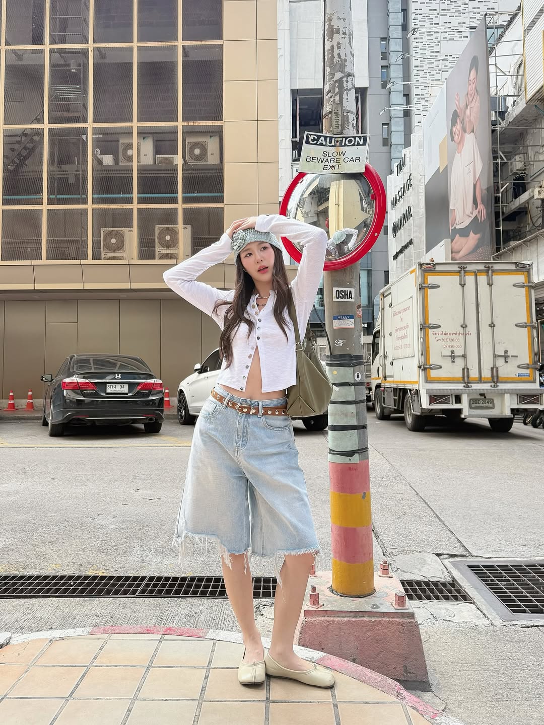 Với quần denim ống rộng lửng và áo dáng ngắn, giày búp bê giúp trang phục trông cân đối, không tạo cảm giác nặng phần chân. Ở những set đồ đơn giản như áo crop top và chân váy midi, kiểu giày này có thể tạo điểm nhấn nhờ màu sắc hoặc chi tiết quai mảnh, giúp trang phục bớt đơn điệu. ẢNH: @JINGJING_SL