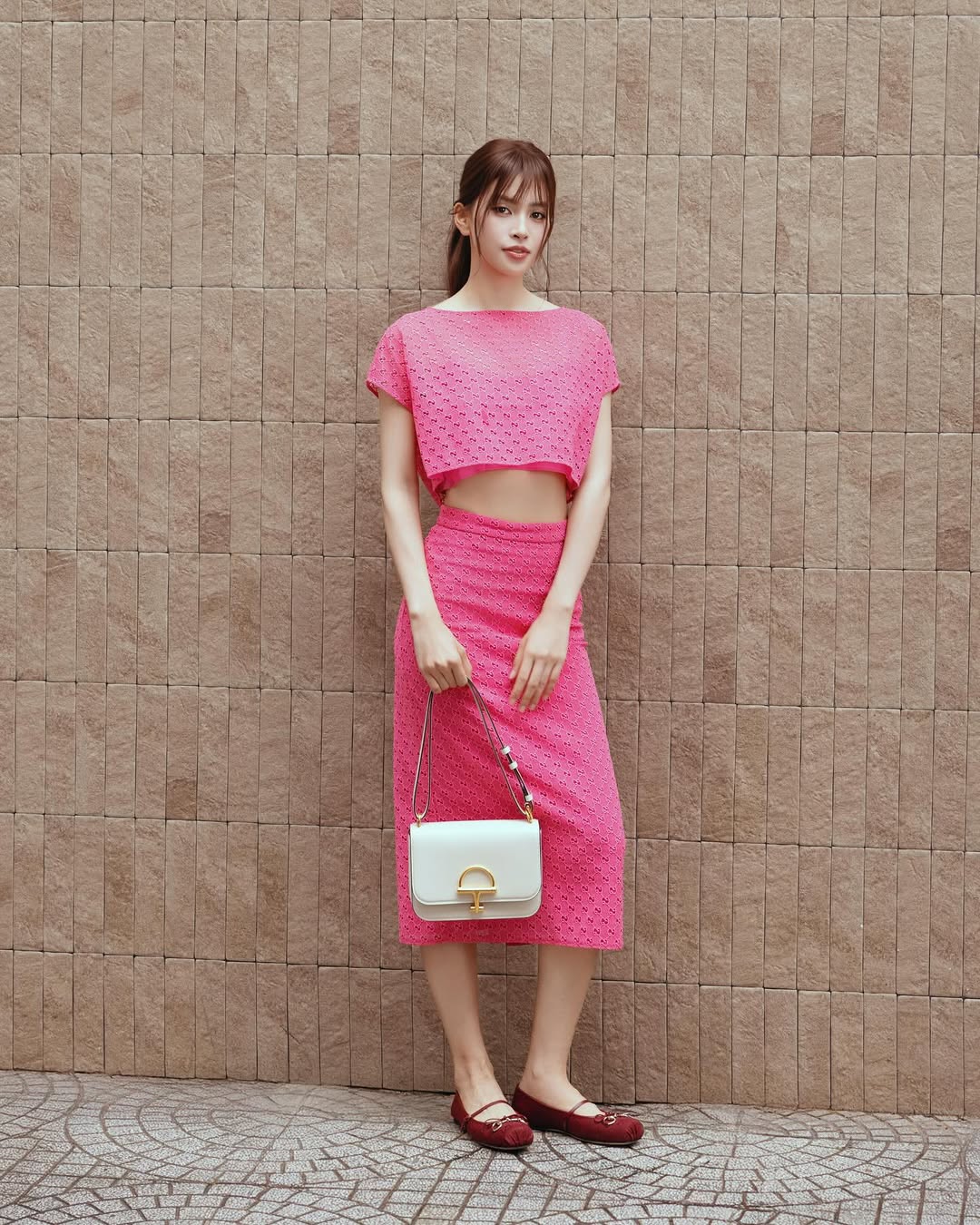 Ngọt ngào với set trang phục tông hồng, tâm điểm thu hút nằm ở đôi giày búp bê mũi tròn màu đỏ mận nổi bật. ẢNH: @TRANTIEUVY_20