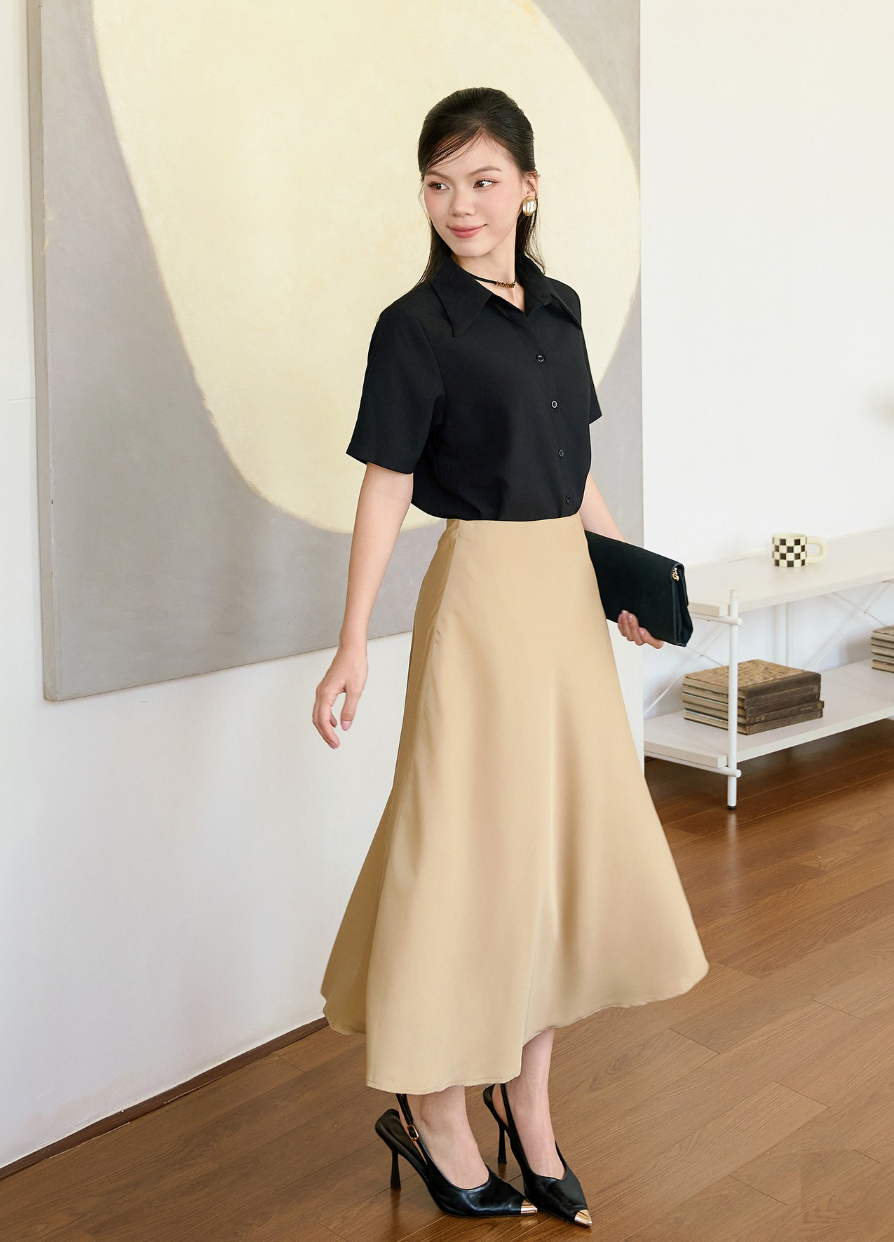 Chân váy có phom dáng dài quá đầu gối, phần cạp cao ôm trọn hông và eo trong khi phần tùng váy loe nhẹ như hình dáng của chữ A viết hoa chính là kiểu trang phục "bất bại" cho mọi bản phối văn phòng. Mùa này, nàng có thể chọn các thiết kế từ vải lụa satin mềm mại để diện cùng áo sơ mi ngắn tay hay áo len, chân váy denim diện cùng áo polo dệt kim hoặc đổi gió bằng các mẫu váy có đường cắt lạ mắt.