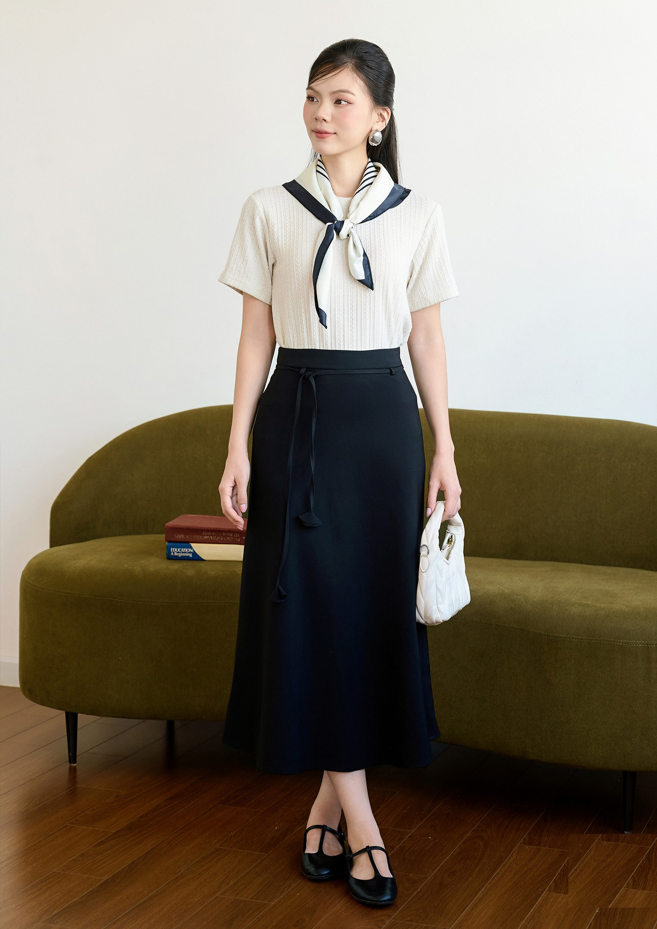Áo dệt kim, áo polo, áo len là những gợi ý để nàng làm mới bản phối cùng chân váy chữ A dáng midi. Bên cạnh đó các thiết kế quen thuộc như áo sơ mi, blouse, áo kiểu cách điệu vẫn là lựa chọn an toàn và sành điệu. ẢNH: GUMAC
