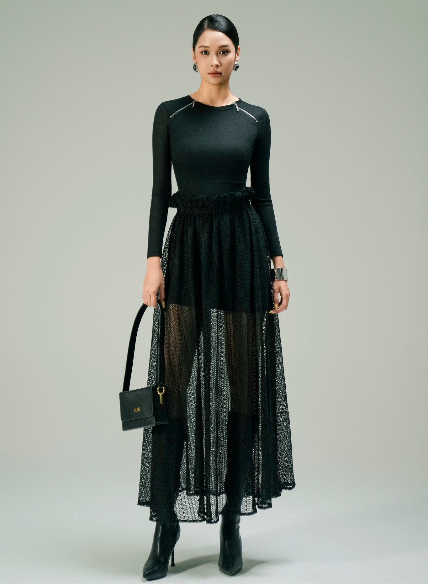 Chân váy dài xẻ tà, chân váy vải sheer phối cùng bốt cổ cao mang đến hiệu ứng thị giác đặc biệt cho các bản phối mùa lạnh. Các thiết kế này không chỉ là ý tưởng cho trang phục dạo phố, dự sự kiện mà còn là lựa chọn hàng đầu cho các bữa tiệc tối sang trọng, các buổi gala hay tiệc cuối năm... ẢNH: ELISE