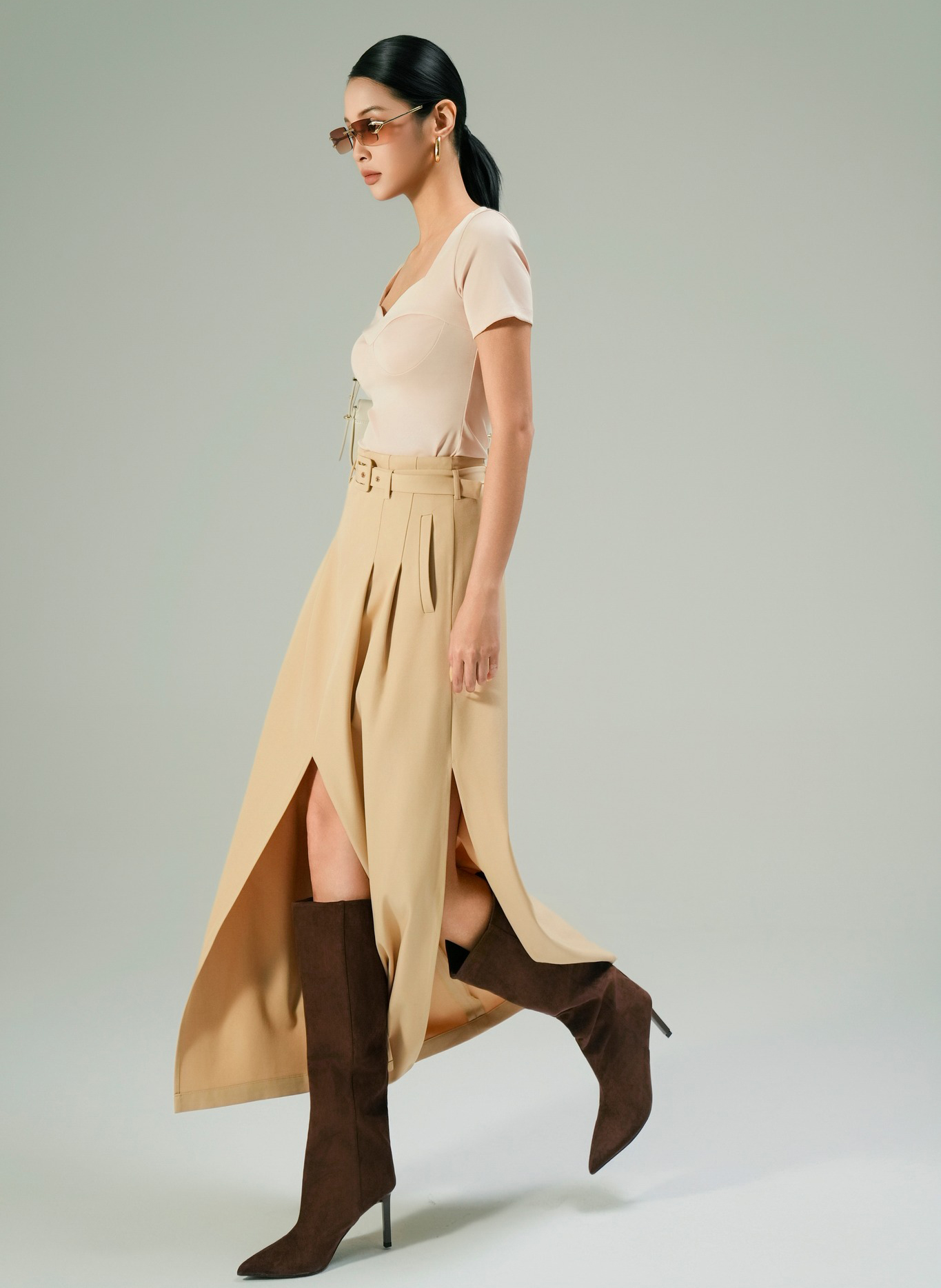 Có cùng phom dáng chữ A nhưng khi đặt cạnh nhau, chân váy có các xếp nếp trông mềm mại, nữ tính hơn kiểu chân váy chữ A tối giản thông thường. Quý cô có thể áp dụng ngay công thức phối đồ với chân váy xếp ly - kết hợp cùng áo ren cách điệu, hoặc chọn bản phối theo set với áo crop và chân váy. ẢNH: MADELYN, CALIE